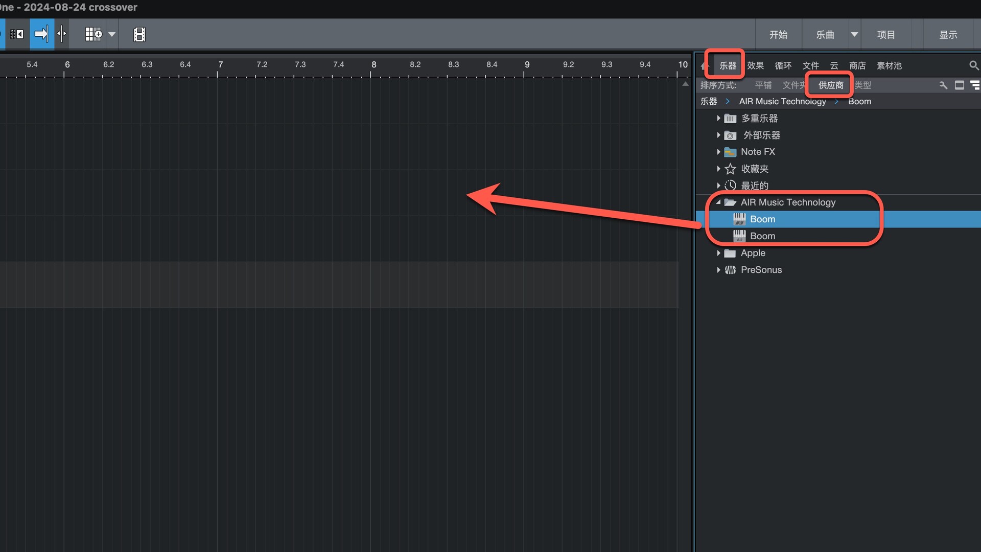 打开Studio One在乐器-供应商下即可找到插件,拖动到左侧即可