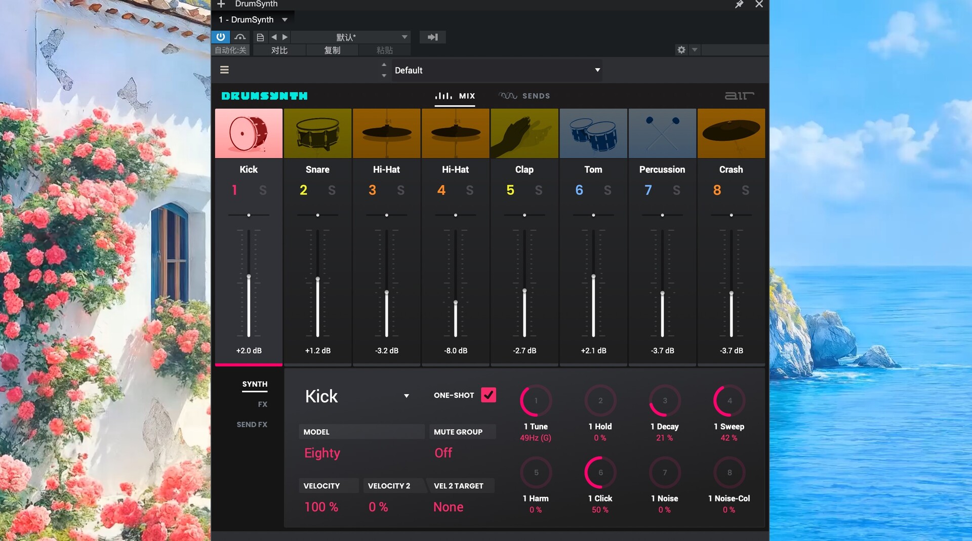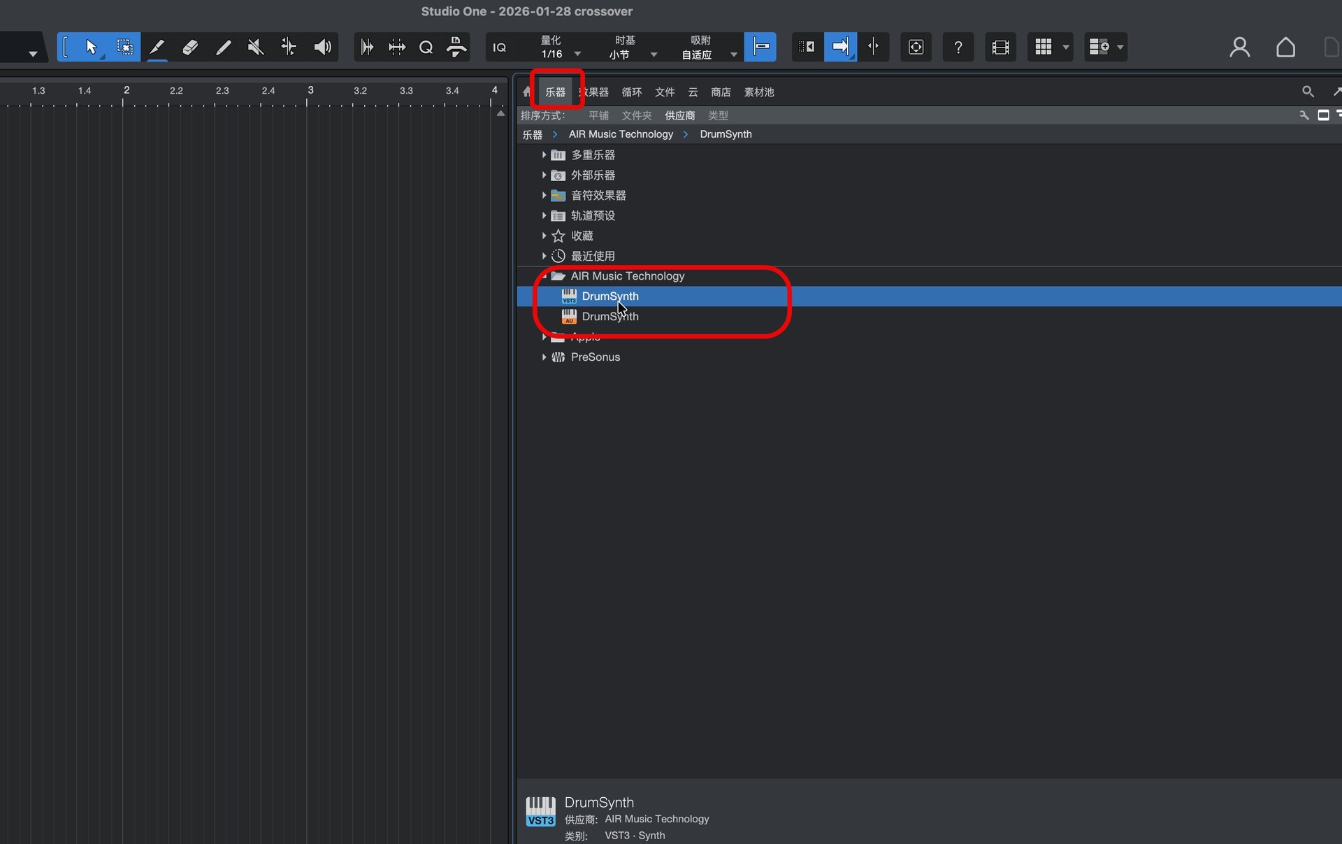 打开studio one,在效果-供应商处找到安装好的DrumSynth 插件