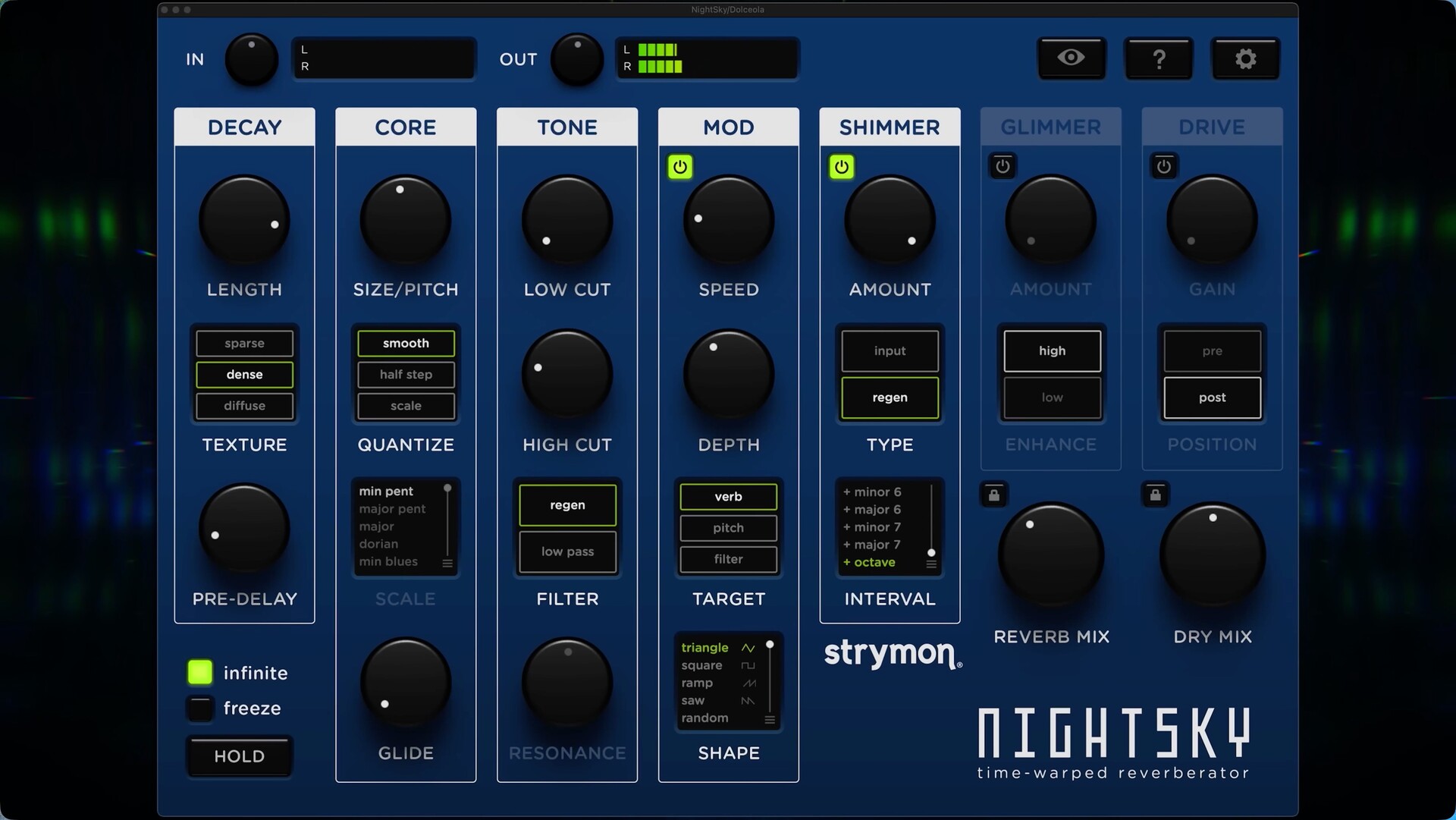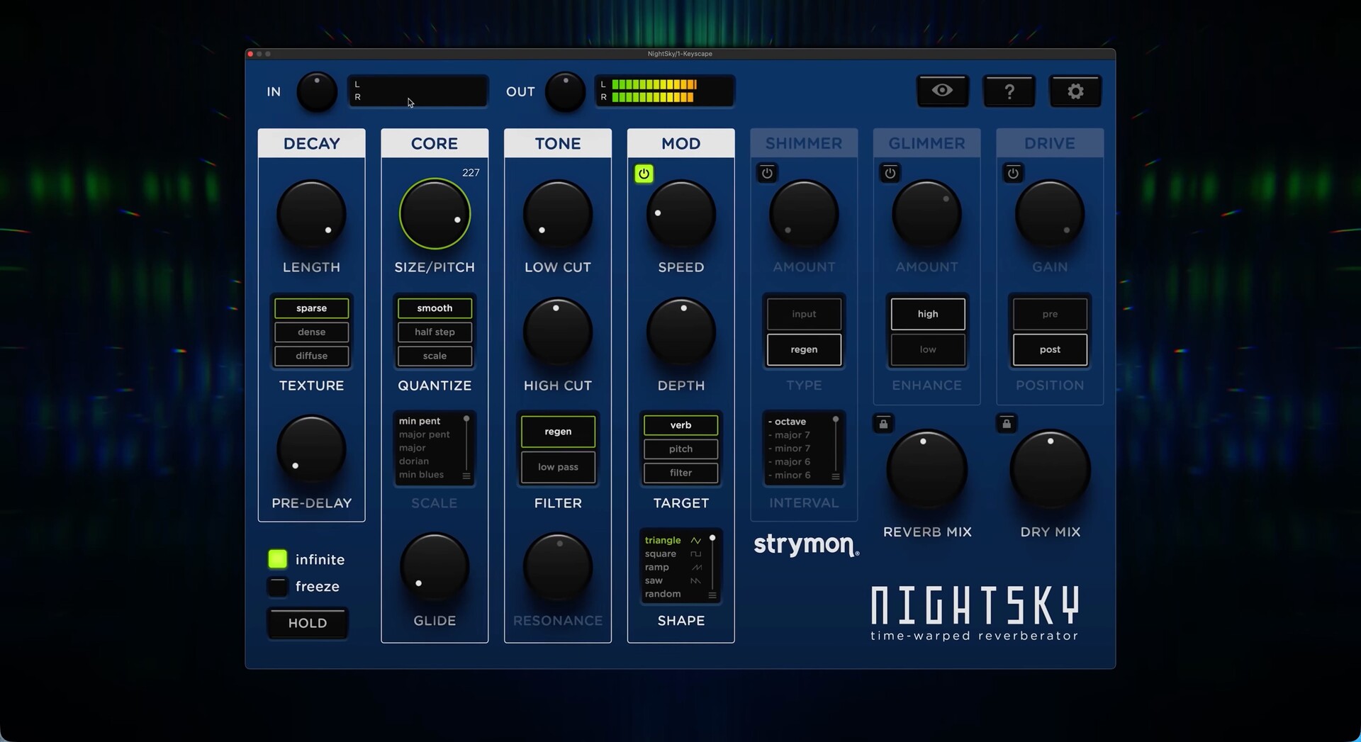 曲核回响:NightSky 的混响核心采用可变处理速率 (VAR) 技术,不仅可以改变混响的大小,还可以改变其音高。音高的变化可以完全平滑,也可以量化为各种不同的音阶,从而彻底改变您的音轨。