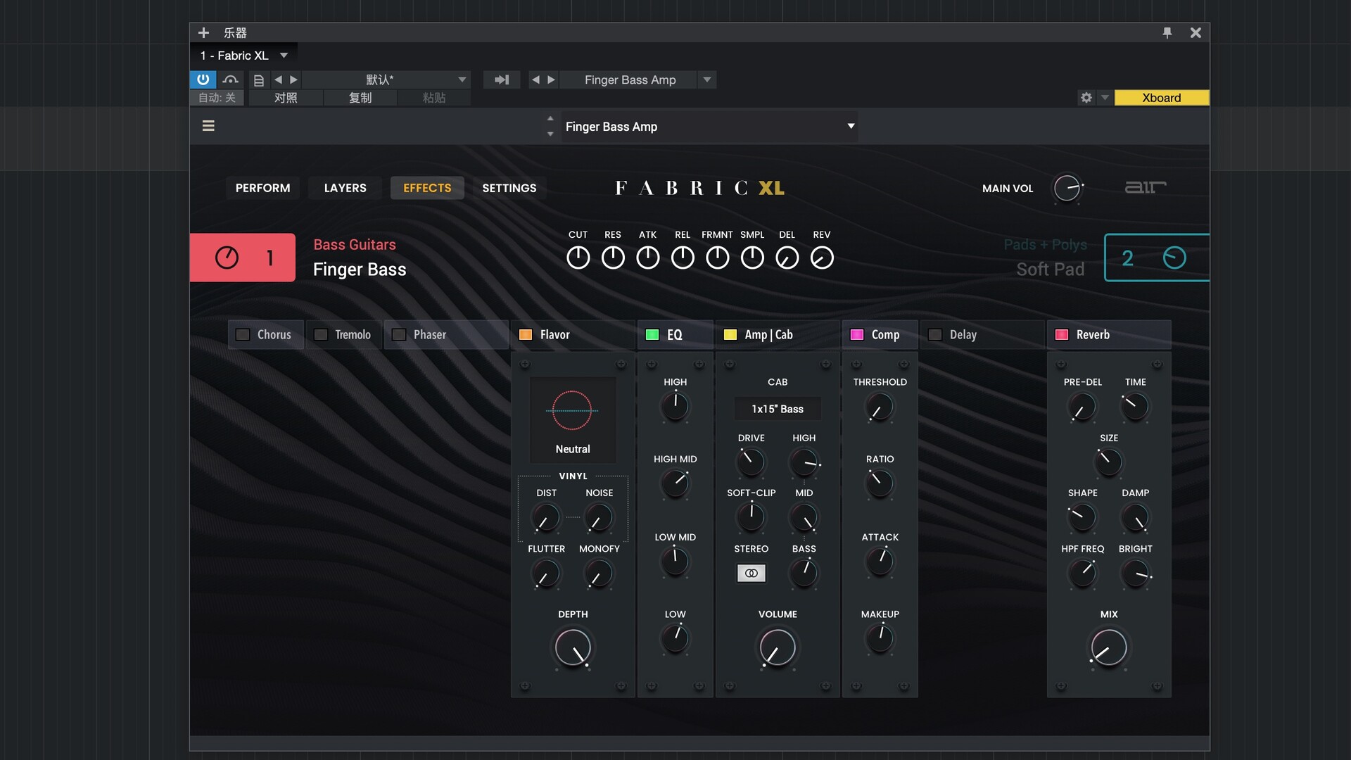 Fabric引擎包含多种效果器,例如均衡器、放大器和箱体模拟、压缩器、混响、延迟和调制。利用乐器内置的尖端效果器,您可以创造出绚丽的闪烁音效、阴郁的回声或空灵的相位激光效果。