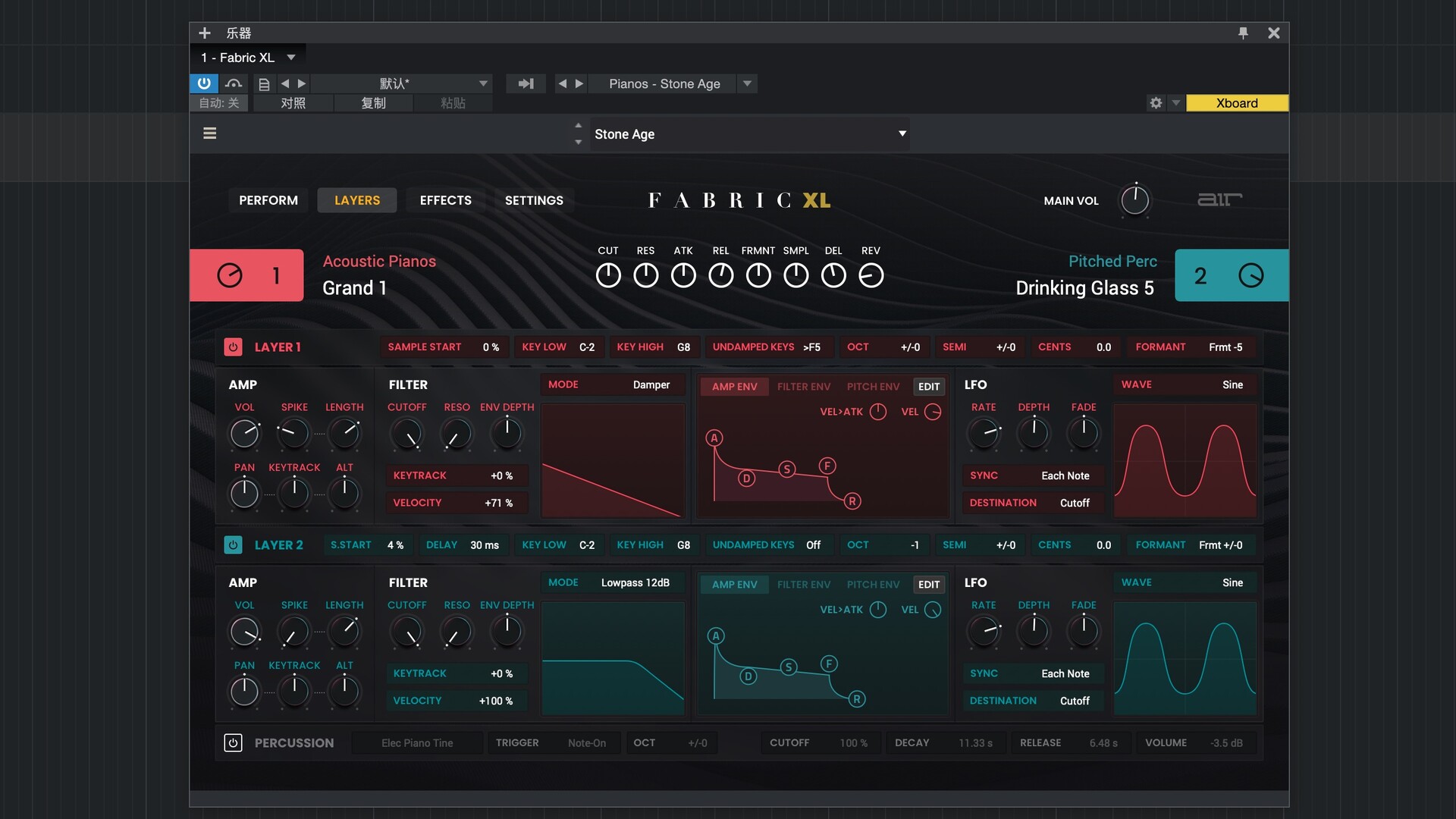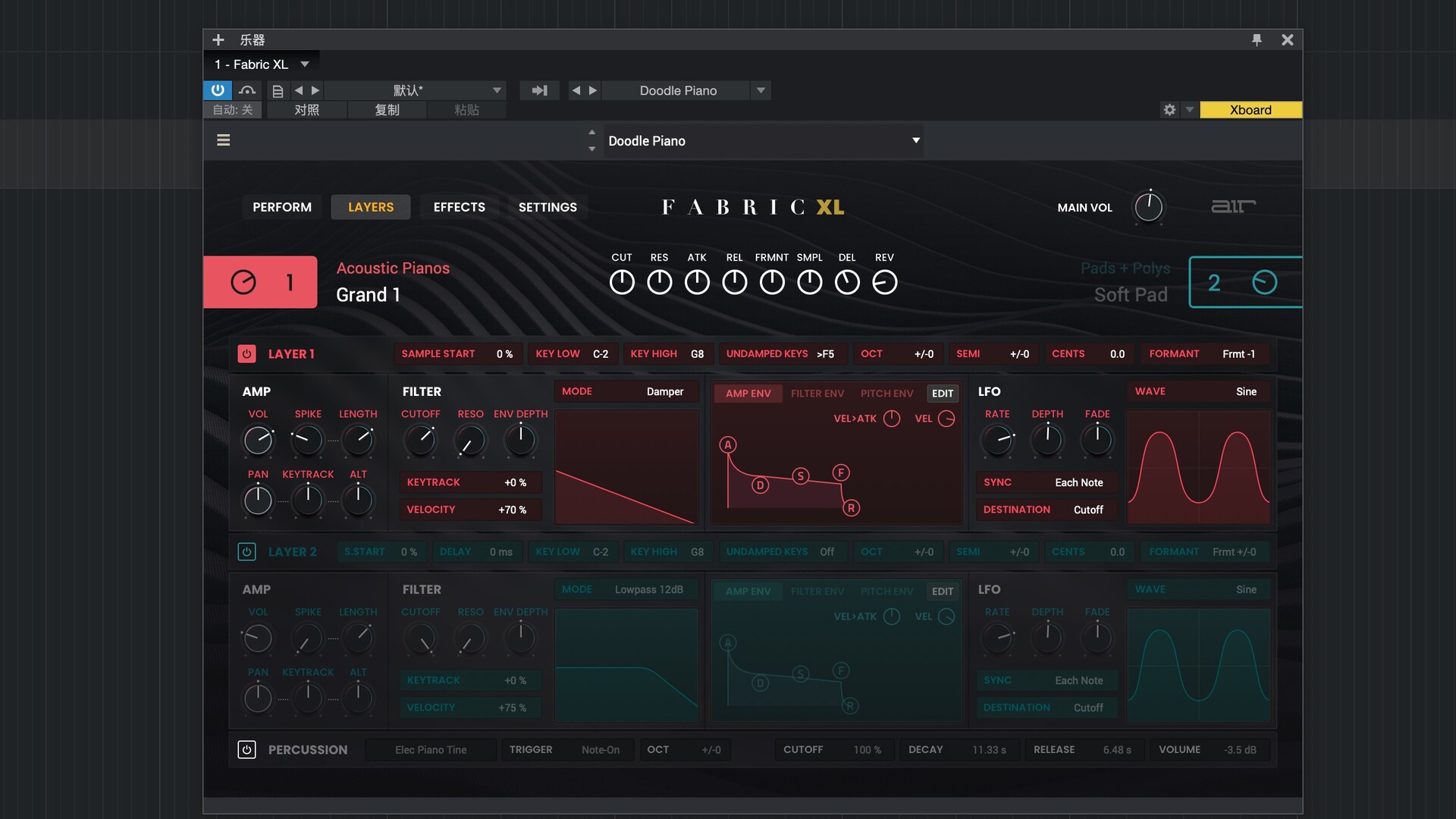 Fabric 音色库的声音引擎包含两个多采样层振荡器和一个打击乐层,并带有独立的滤波器、包络和低频振荡器控制。您可以随心所欲地调整预设音色,也可以利用其强大的声音设计和编辑功能从零开始构建音色。