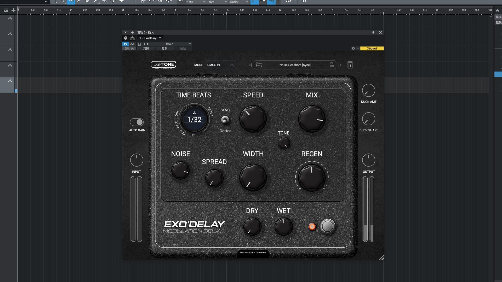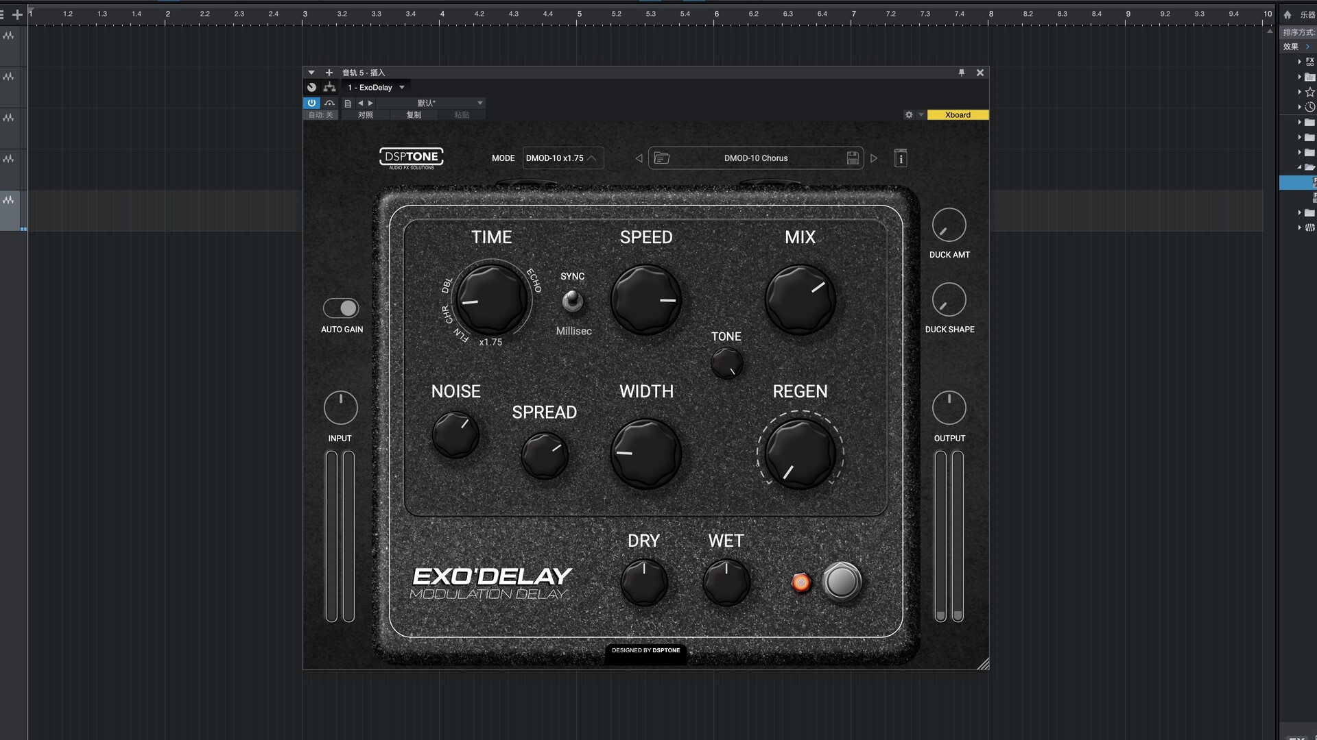 自动增益 (AUTOGAIN):调节饱和级的输出电平,使其与输入电平匹配。闪避幅度 (DUCK AMT):效果信号的电平衰减量。闪避效果的持续时间由延迟时间 (TIME) 旋钮控制。 闪避形状 (DUCK SHAPE):控制闪避响应的平滑度或锐利度。