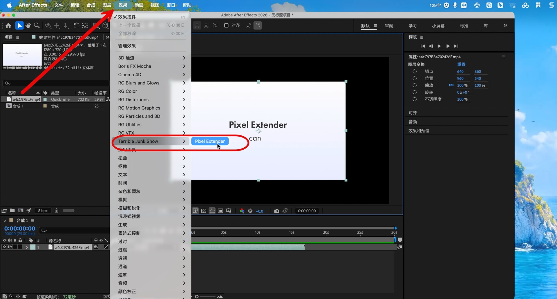 测试环境:macOS26系统 AE2026 M芯片将Pixel Extender拖动到右侧的Plug-ins文件夹中即可,如图