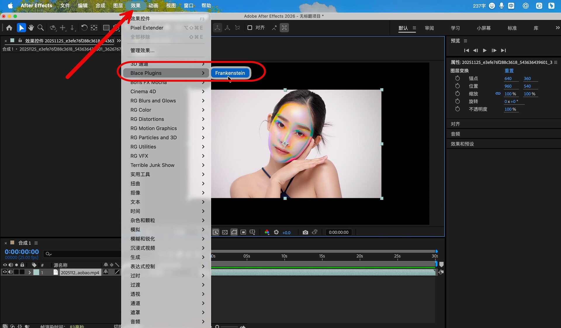 打开AE,在效果处即可找到安装好的插件,如图