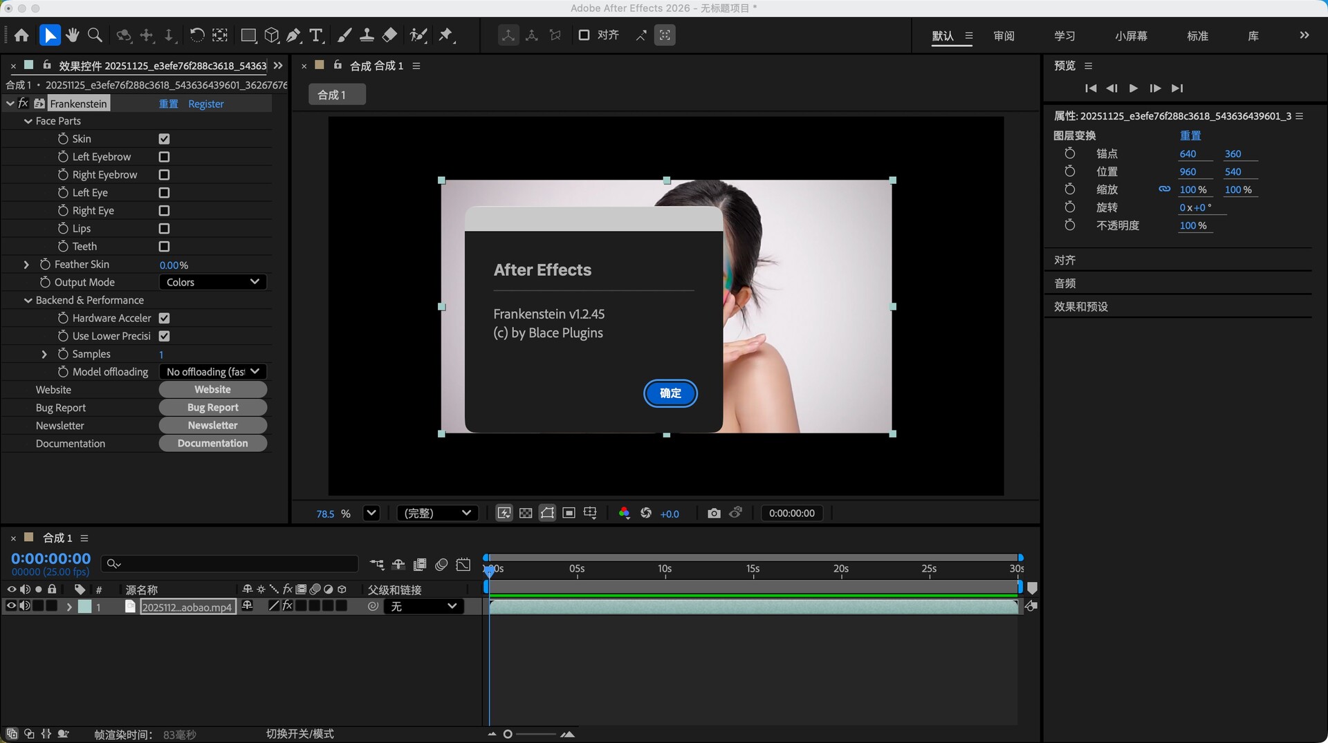 Frankenstein 是一款由 Blace Plugins 开发的 AI 人脸分割插件,适用于 After Effects 与 Premiere Pro,可自动将脸部的皮肤、眼睛、嘴巴、牙齿等区域精准分离成独立遮罩,方便进行美化、调色或特效处理。插件基于本地 AI 引擎运行,速度快、稳定性高,并提供清晰的 UI,适合需要进行人像后期或创意效果的用户。
