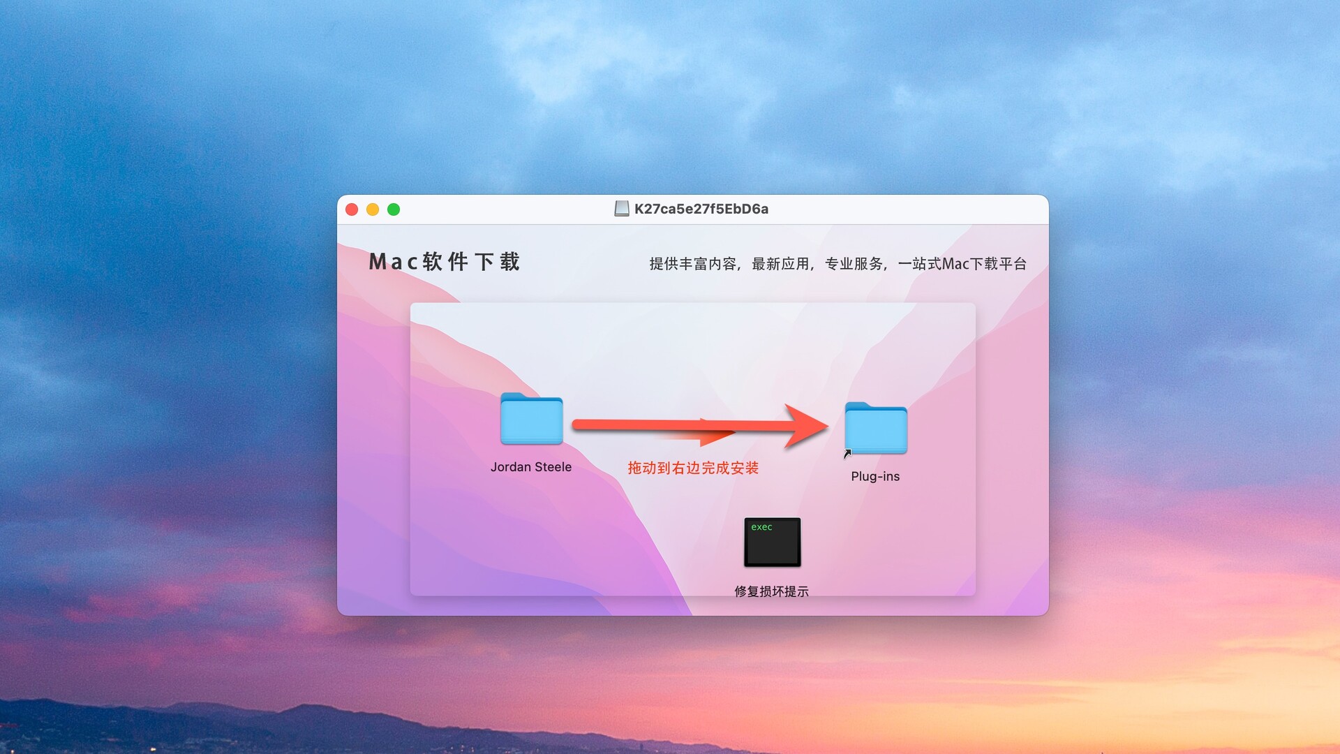 支持系统:After Effects 2026-2022安装包下载完成后打开,将Jordan Steele拖动到右侧的Plug-ins文件夹中即可,如图