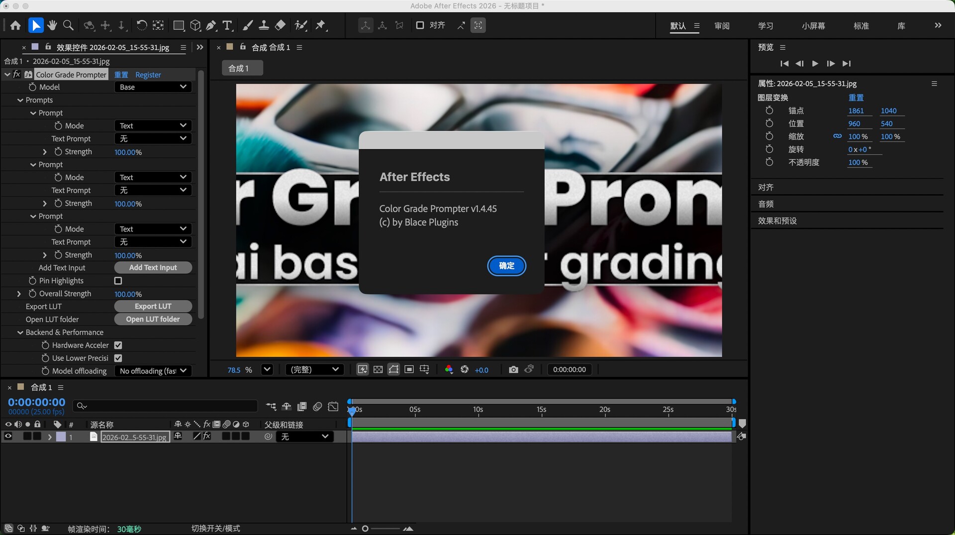Aescripts Color Grade Prompter for mac(AI色彩分级提示器AE插件),基于 AI 的插件,可根据(多个)文本输入或图像图层轻松快速地进行颜色分级,并支持 LUT 导出