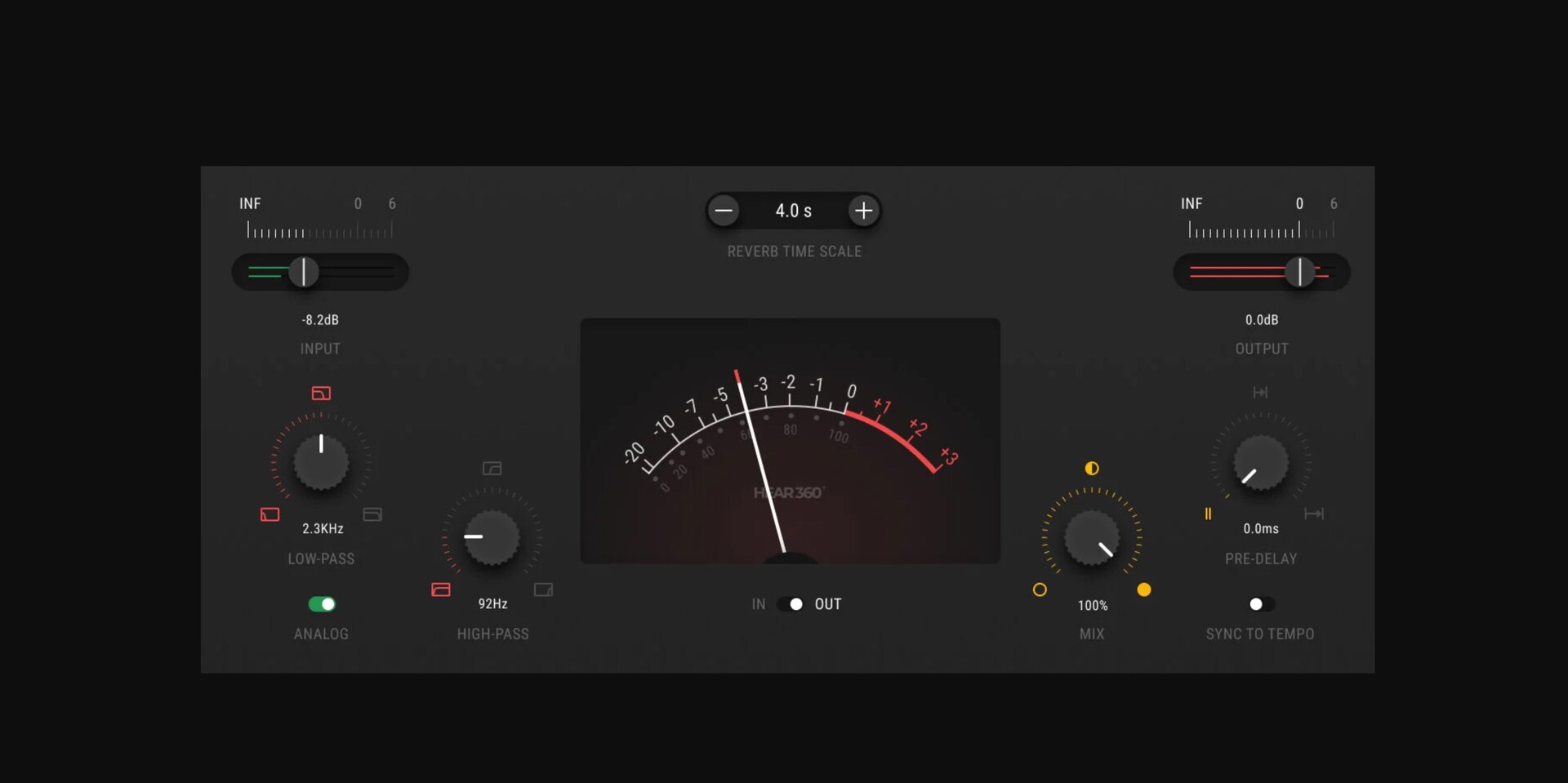 向右或向左滑动输入和/或输出拨杆,即可提升或衰减输入和输出信号的增益。输入增益调节混响引擎之前的输入音频信号。输出控制调节包含混响在内的完整信号。