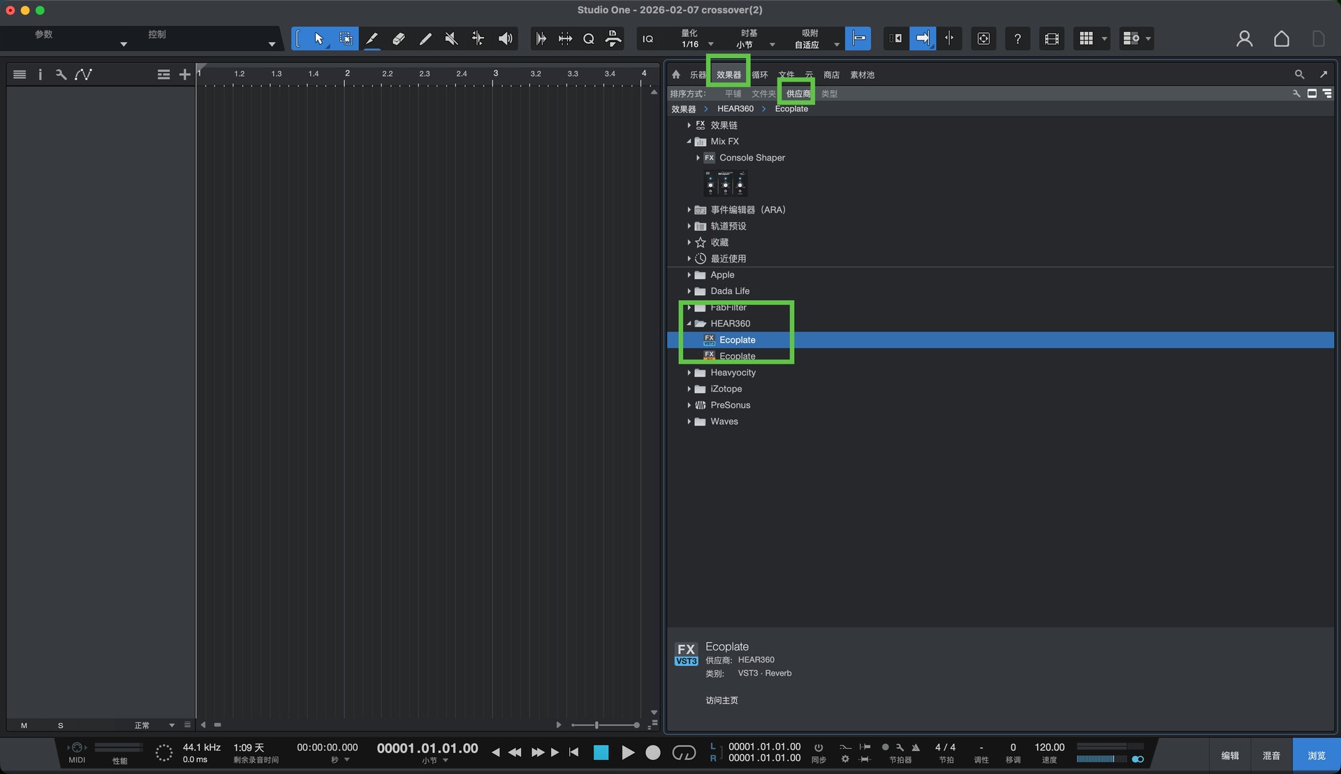 打开studio one,在效果-供应商中就可以找到此插件,如图: