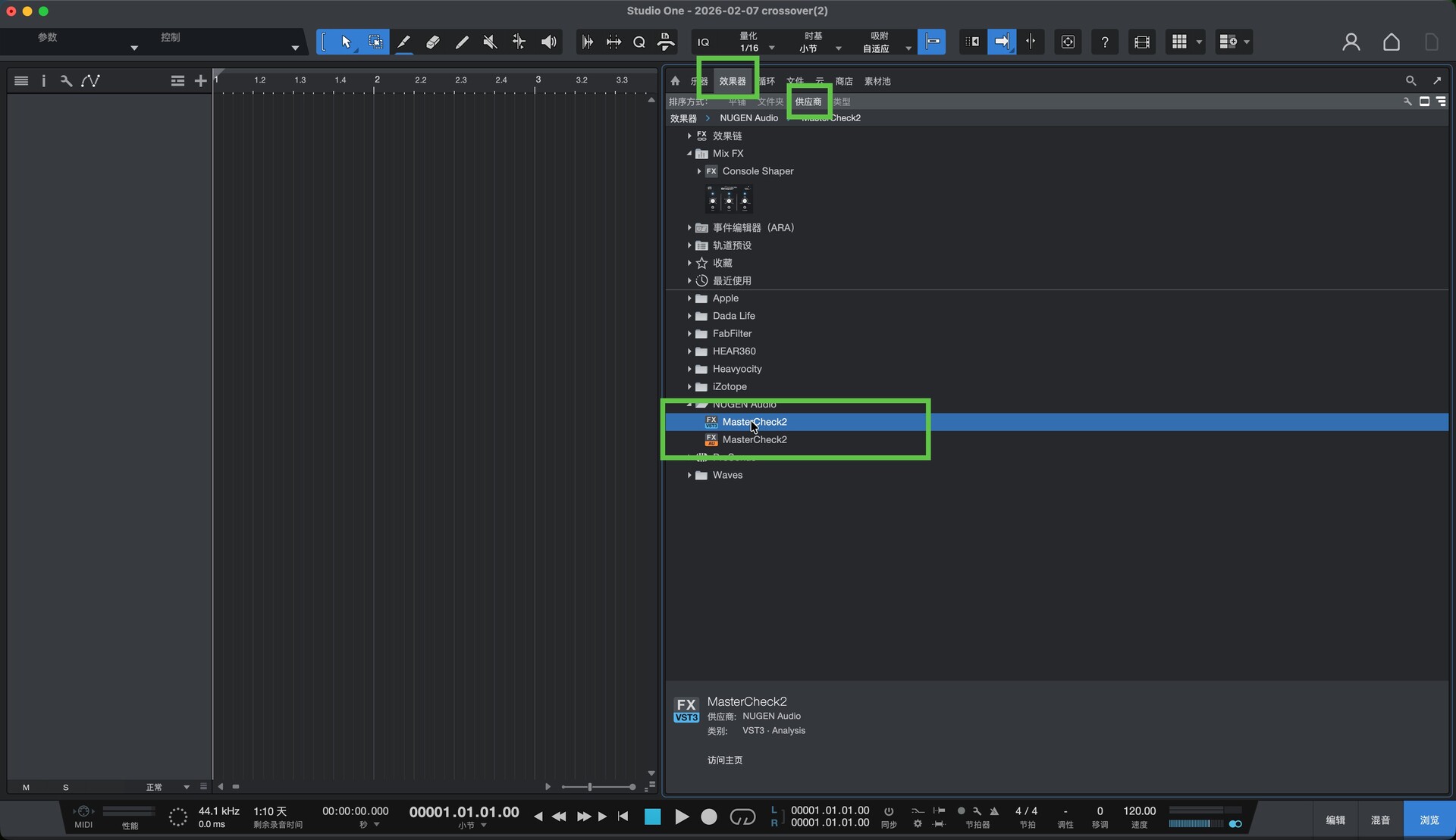 打开studio one,在效果-供应商中就可以找到此插件,如图: