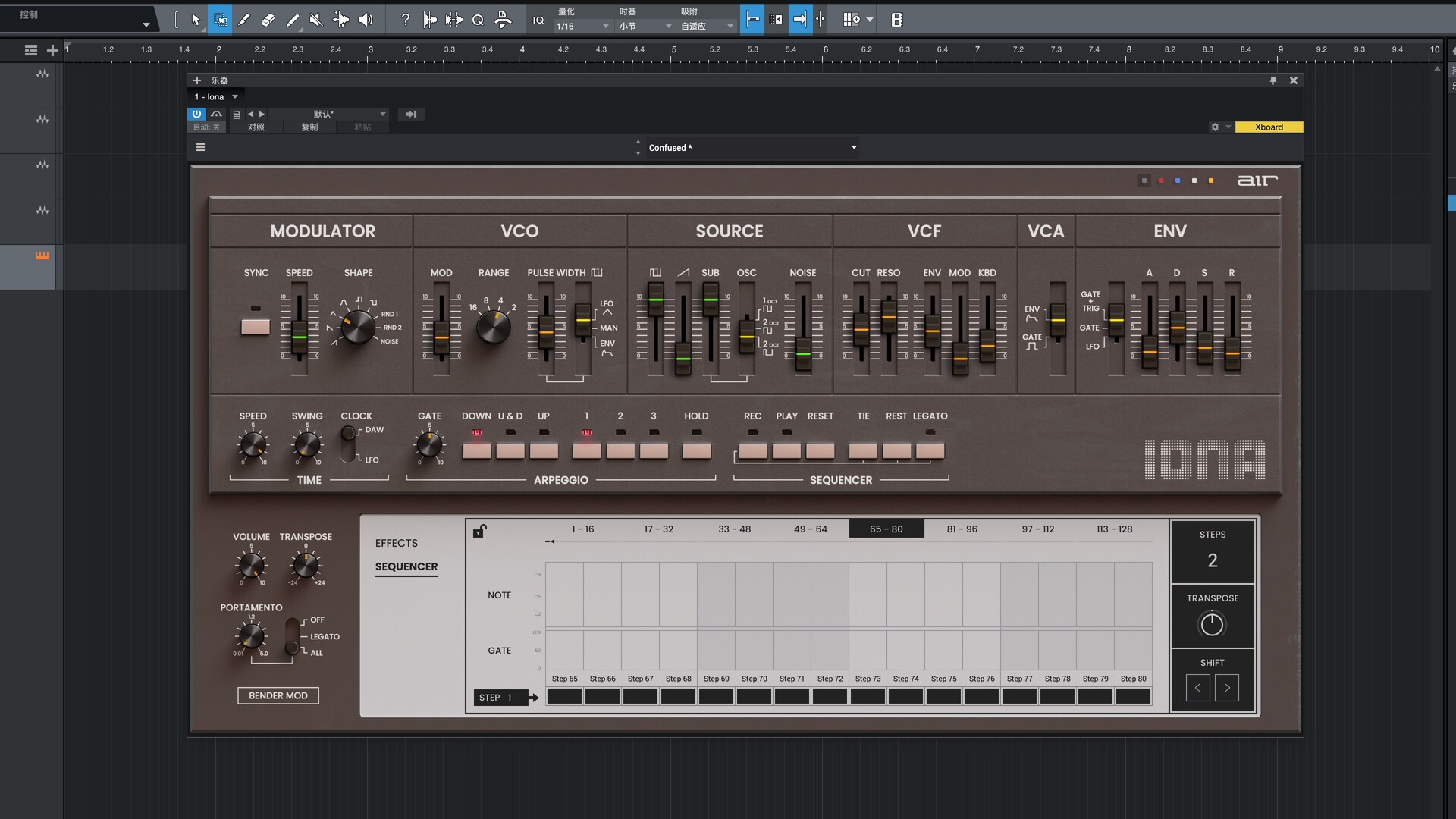 利用 128 步音序器添加灵动且不断变化的节奏型,该音序器在保持原乐器音色的同时,还增加了移调/音高调整和图形编辑器功能。Iona 内置的琶音器可瞬间激发您的节奏灵感。