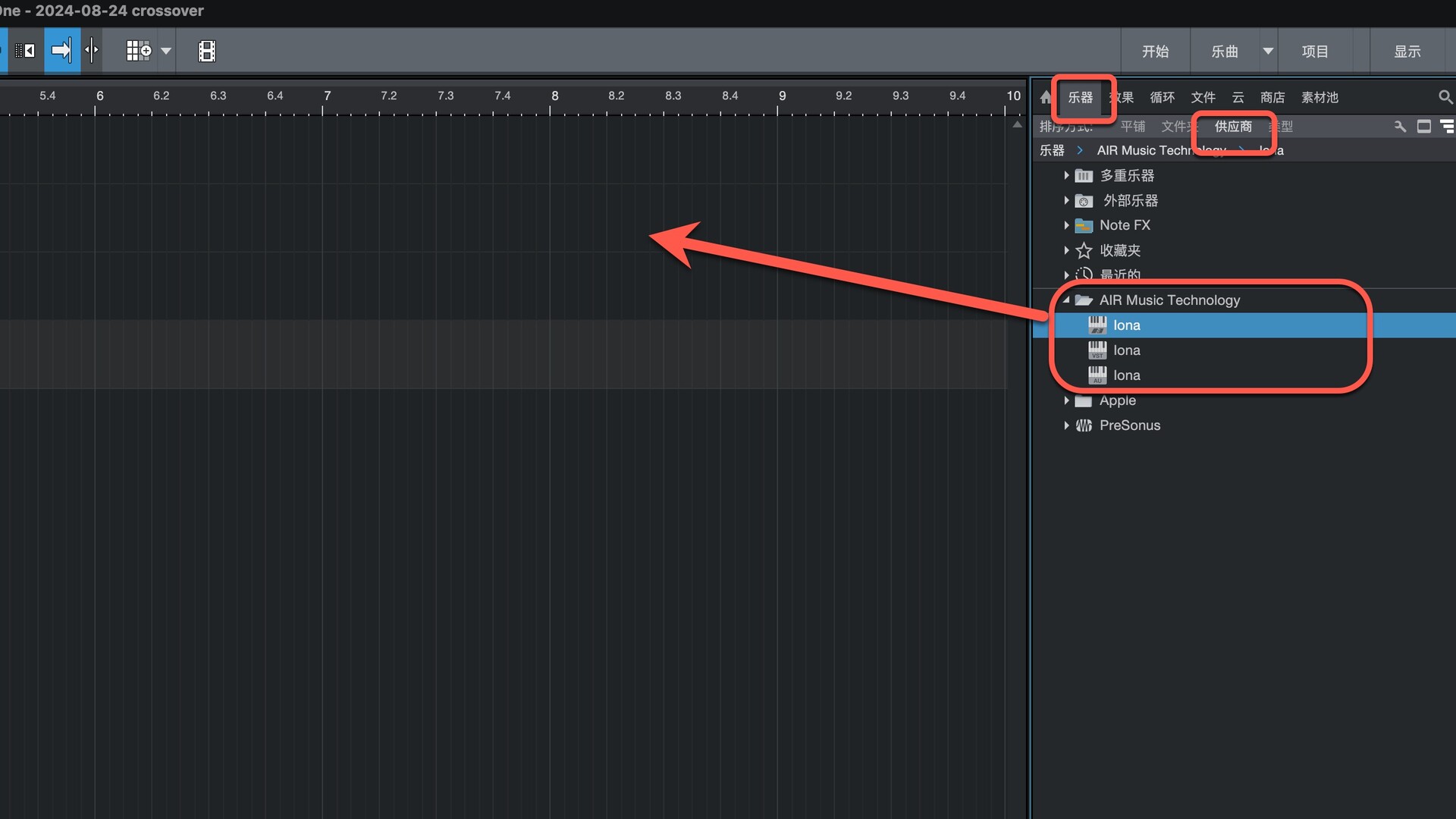 打开Studio One在乐器-供应商下即可找到插件,拖动到左侧即可