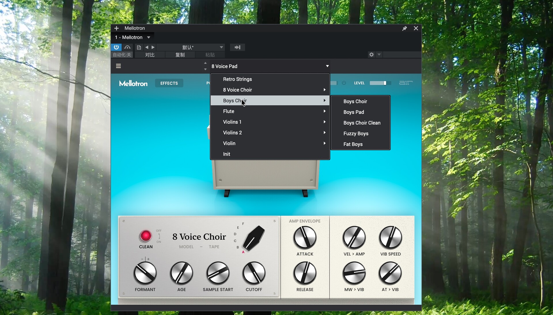 AIR Mellotron 内置 6 个磁带音色库,包含原版 Mellotron 的长笛、合唱和弦乐磁带采样,带来真正原汁原味的音色。您还可以选择原始磁带的“脏”版和“干净”版。其他音色调整参数包括共振峰、老化度和采样起始点。此外,它还内置 30 个出厂预设,助您快速上手,并提供多种内置效果,包括全新的 AIR Flavour(即刻拥有低保真音色)。