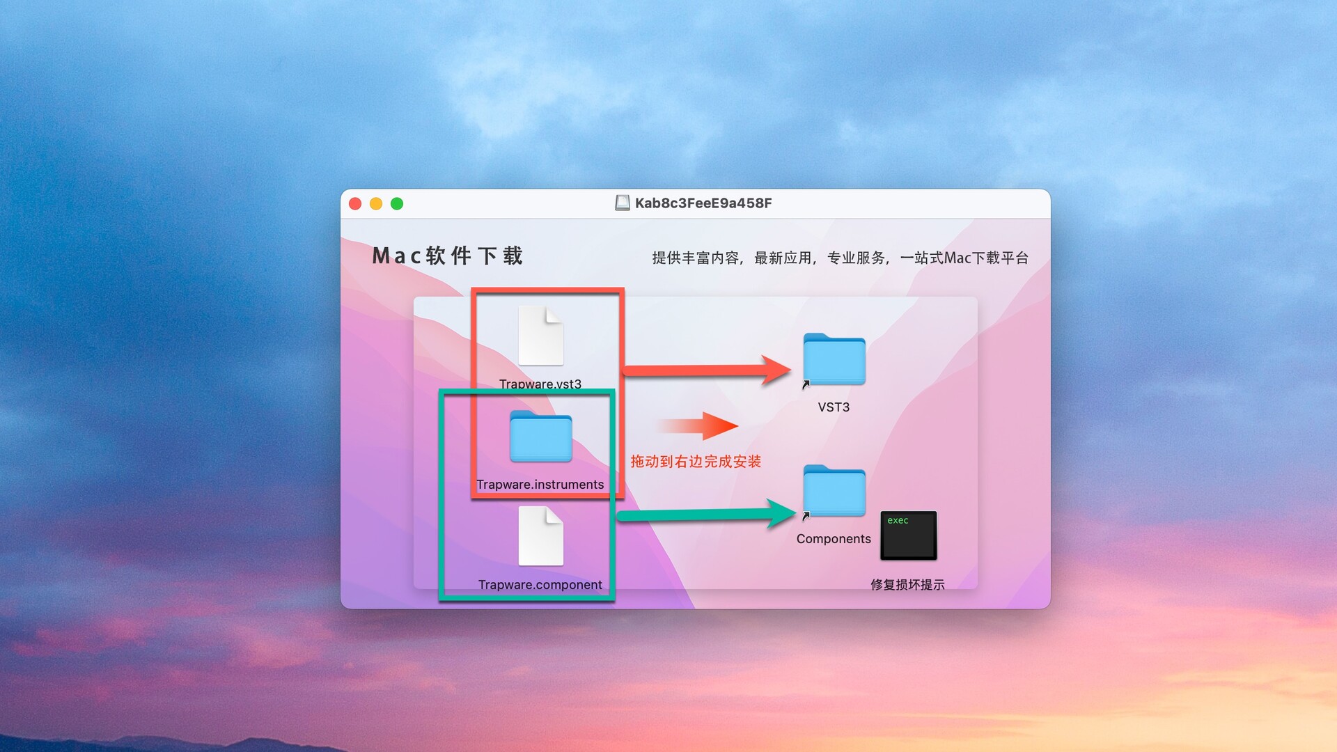 安装包下载完成后打开,将 Trapware.vst3 和 Trapware.instruments 文件夹复制到VST3文件夹中,再将 Trapware.component 和 Trapware.instruments 文件夹复制到Components文件夹中