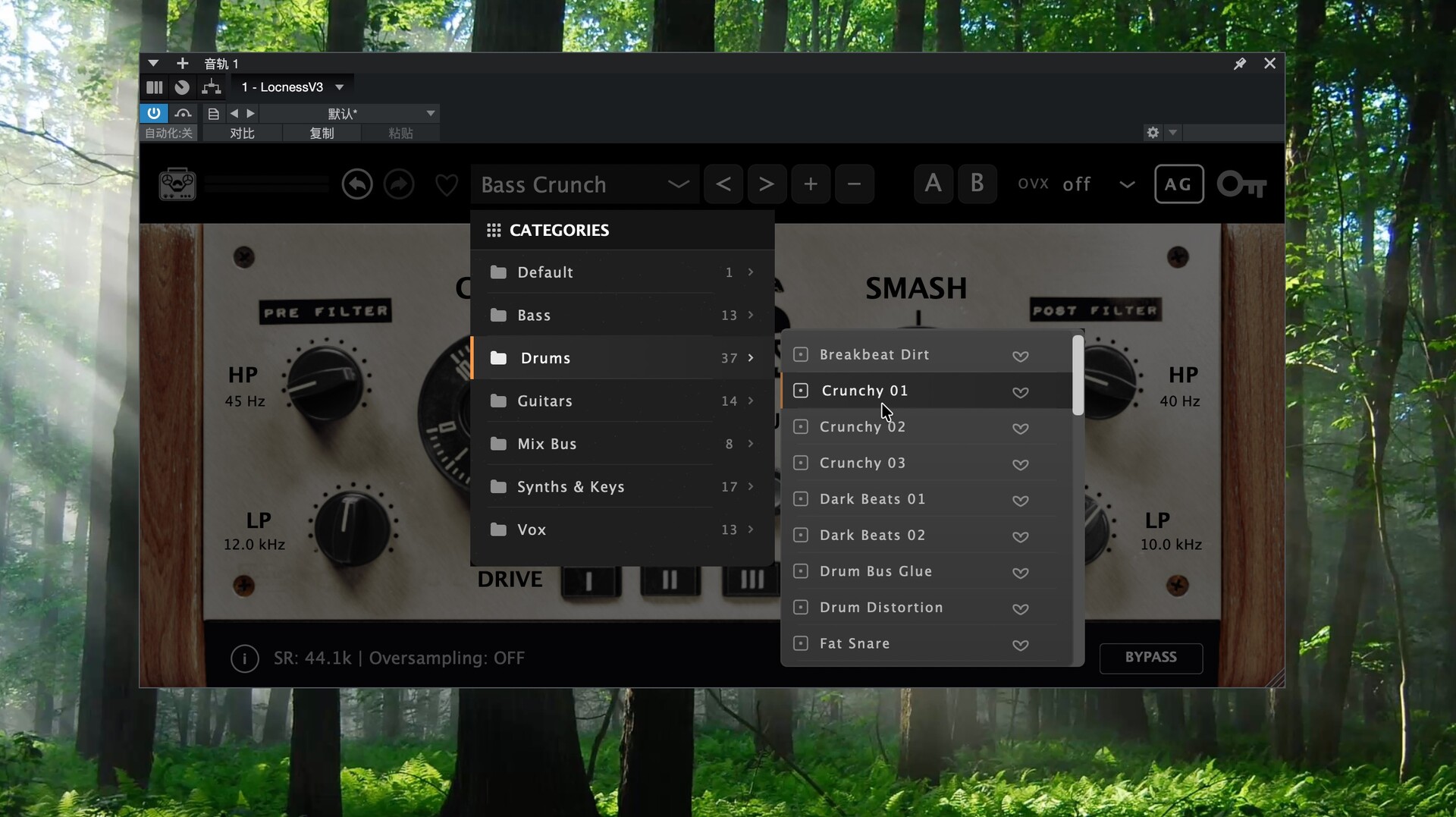 Loc-Ness 音色由两大核心控制功能决定。Crust 控制信号通过四个精心建模的模拟饱和电路之一,添加从柔和温暖到强劲过载的各种谐波色彩。Smash 控制将饱和信号送入一个限幅器/压缩器,使声音更加饱满有力,并增强其延音效果——其灵感源自一款传奇老式广播限幅器的激进特性,但更加平滑、更具音乐性,也更易于控制。