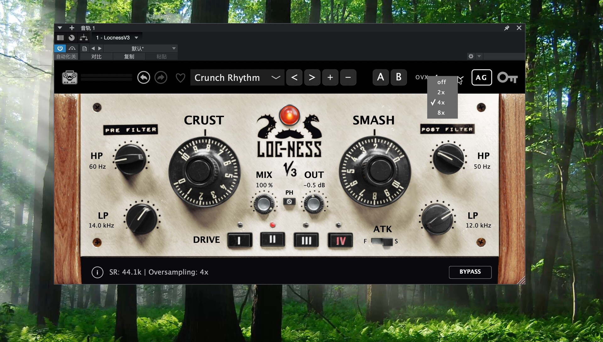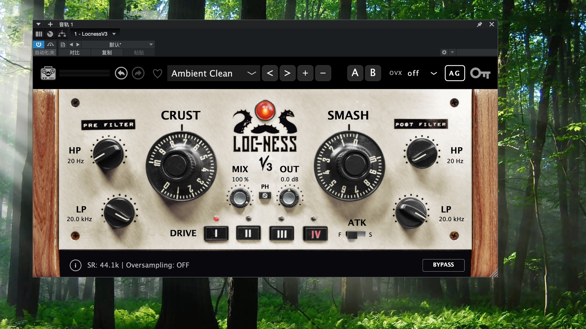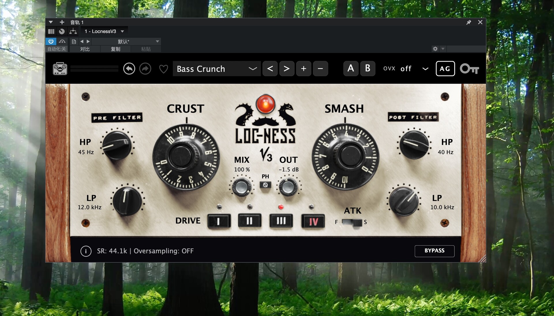 Loc-Ness 音色由两个主要控制旋钮决定。Crust旋钮将信号送入四个精心建模的模拟饱和电路之一,添加从柔和温暖到强劲过载的各种谐波色彩。Smash旋钮则将饱和后的信号送入一个限幅器/压缩器,用于延音和增强声音——其灵感源自一款传奇老式广播限幅器的激进特性,但更加平滑、更具音乐性,也更容易控制。