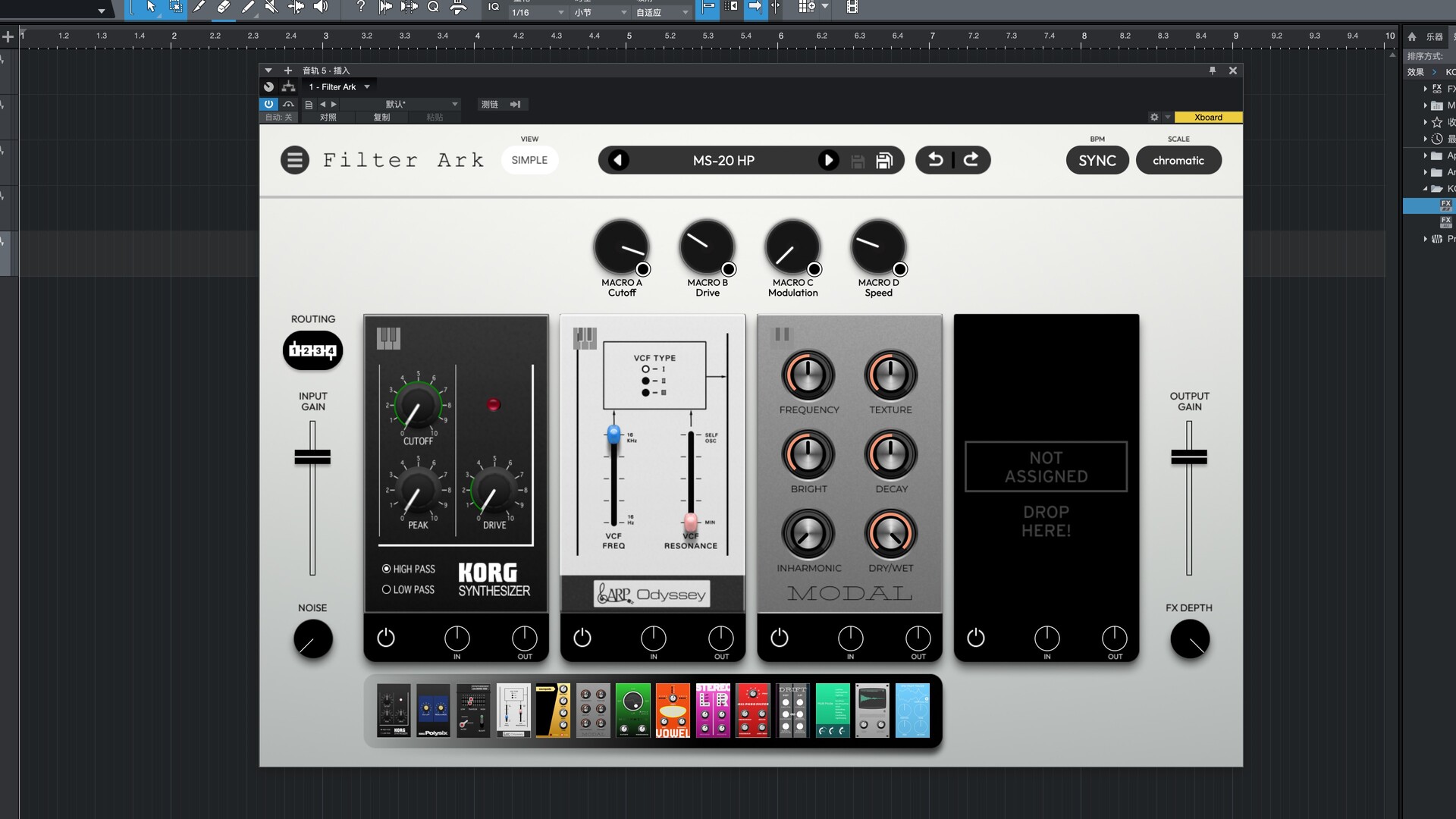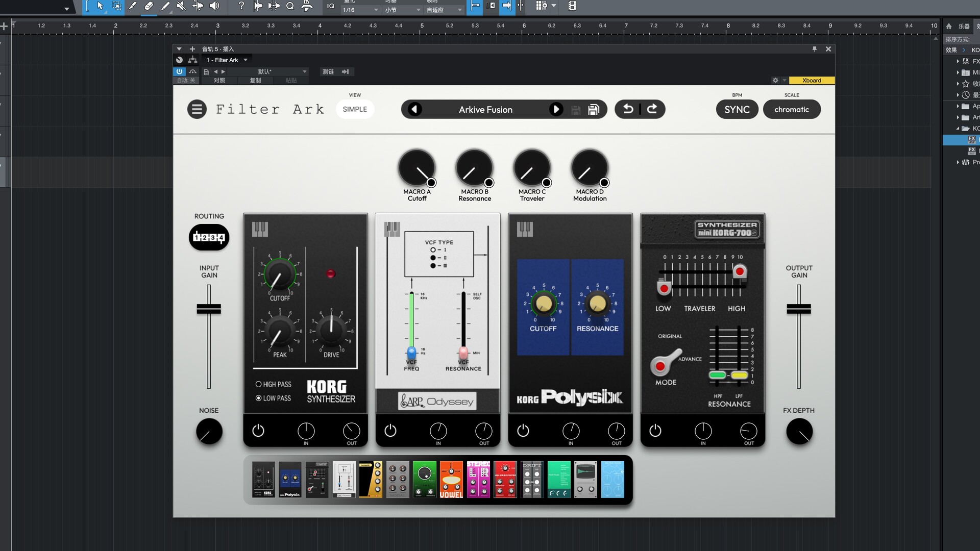 Filter Ark 的核心在于那些定义了合成器历史音色的滤波器。从 MS-20 的原始驱动力和 Polysix 的平滑扫频,到 miniKORG 700s 的温暖厚实音色和 ARP ODYSSEY 的尖锐共鸣,这些标志性的设计都得到了忠实还原,精度极高。