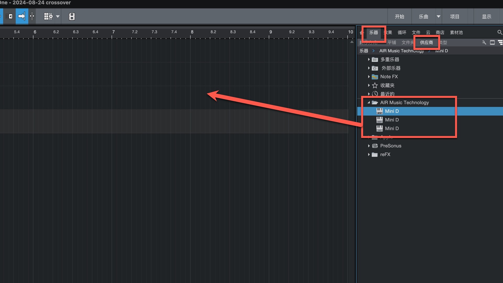 打开Studio One在乐器-供应商下即可找到插件,拖动到左侧即可