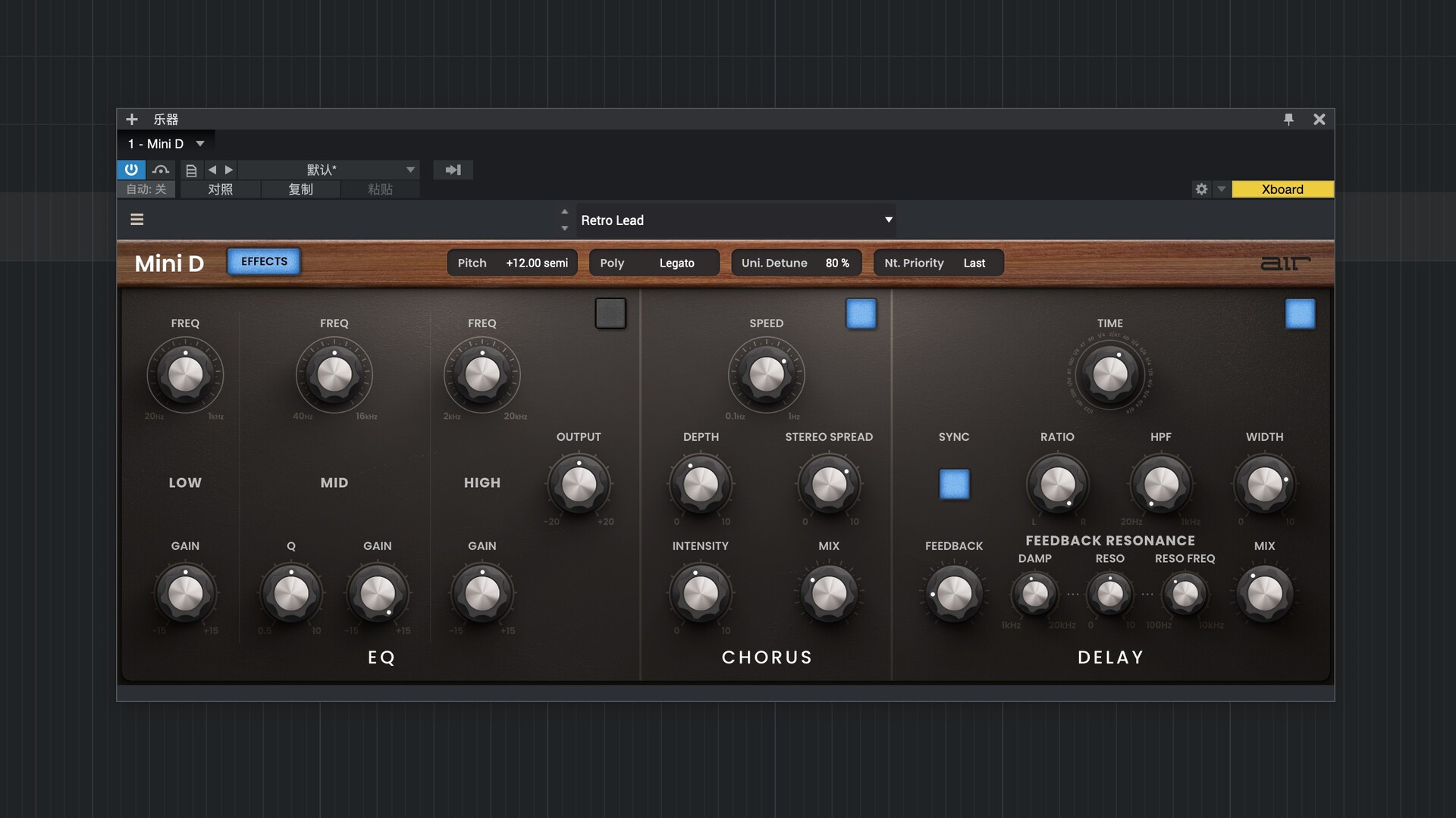 与原版不同,Mini D 在信号链末端自带三种效果,无需外接设备或在插件后添加其他效果,即可为您的声音增添色彩。它包含:带低/中/高频段和增益控制的均衡器;可通过扩展和混合控制拓宽声音的立体声合唱效果;以及带有速度同步、高通滤波、立体声宽度、反馈等功能的延迟效果。