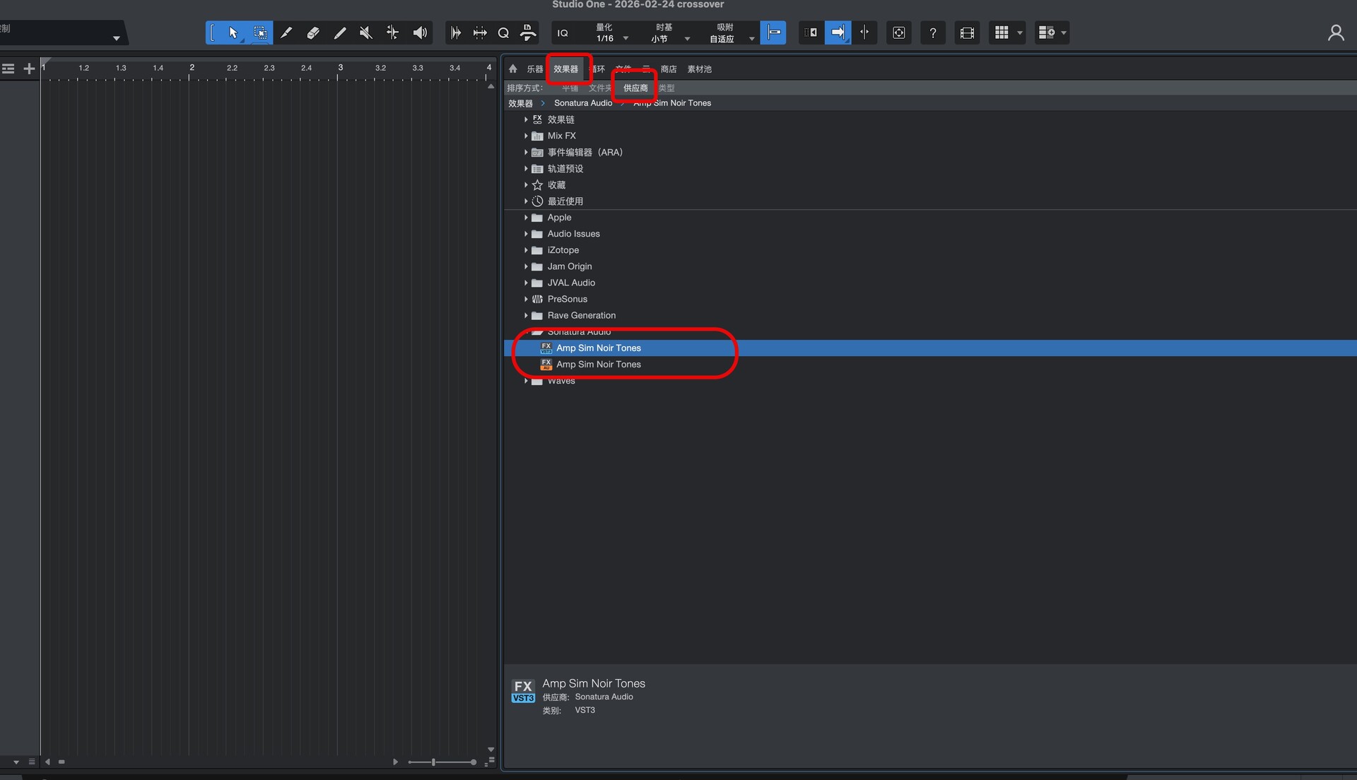 打开studio one,在效果-供应商处即可找到安装好的插件,拖动到左侧音轨处如图