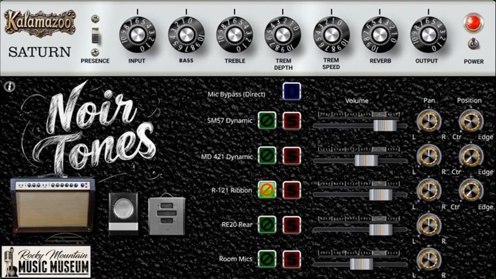 - 00:26 - Saturn 效果器,开启 Presence 功能,降低低音,提高高音,混响 6,使用 MD421、R-121 和房间麦克风