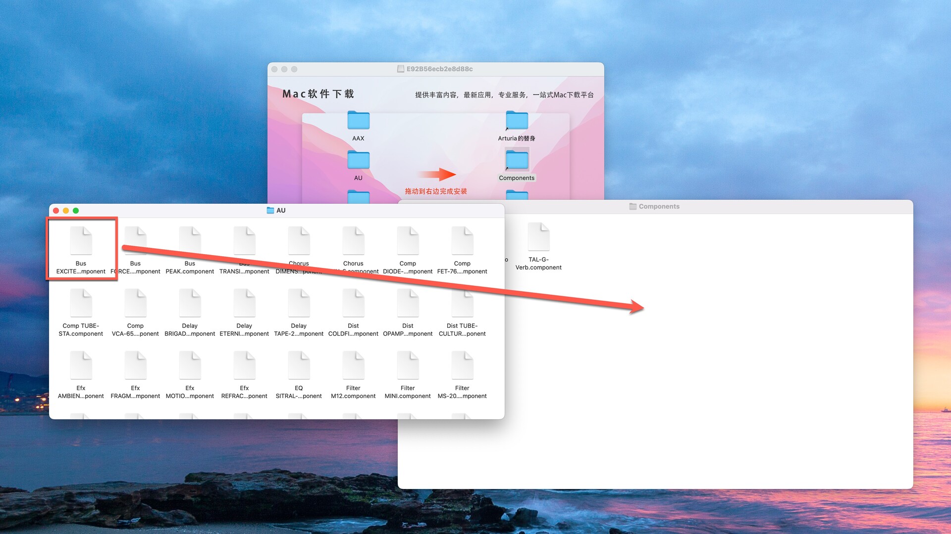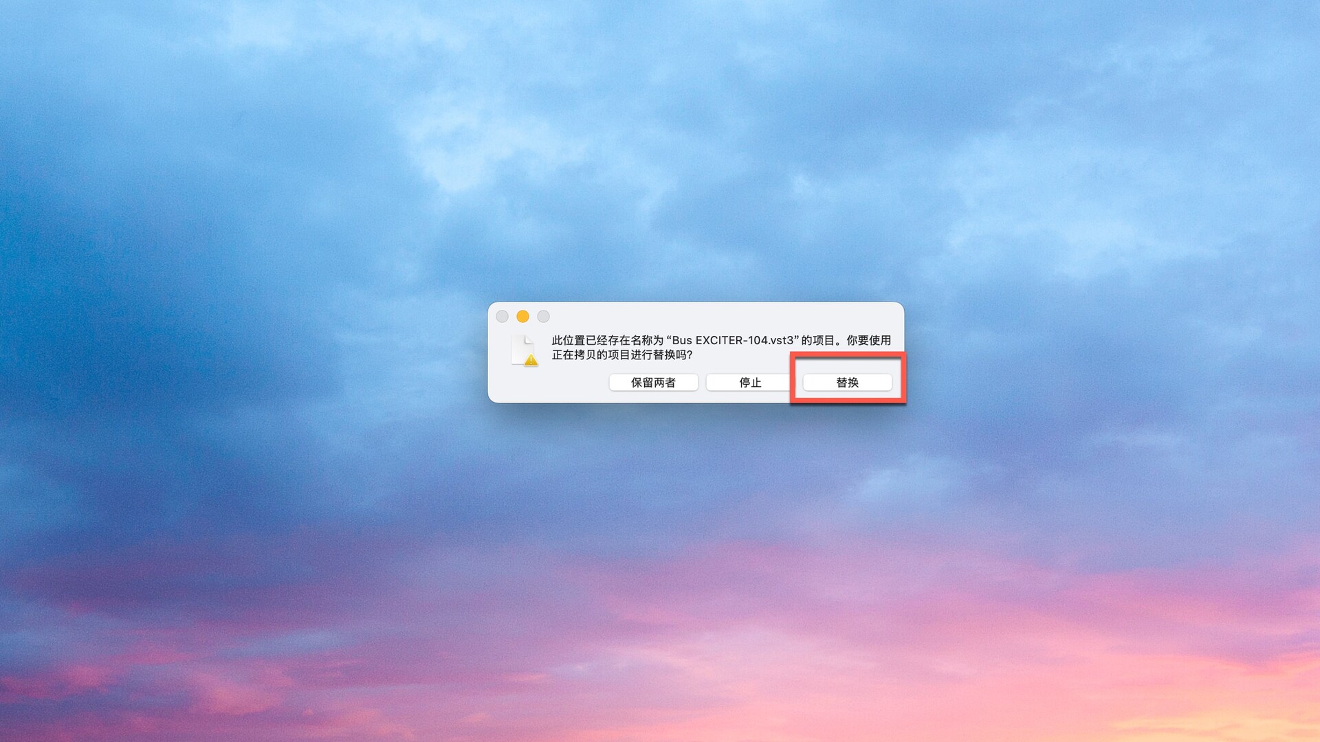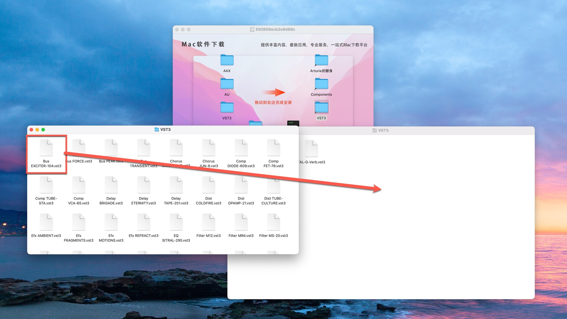同理,分别在AU和VST3找到Bus EXCITER的破解文件,然后拖动到右侧对应的文件夹中替换