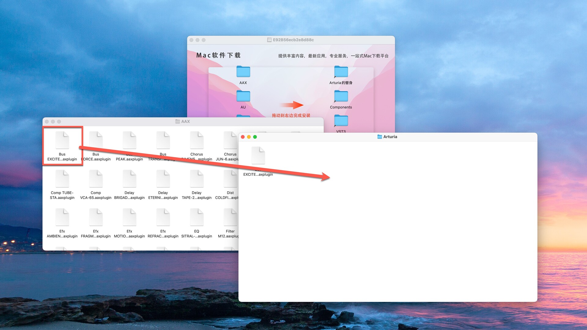 插件安装完成后,返回安装包,打开AXX及Arturia的替身文件夹,找到刚才安装插件的破解文件Bus EXCITER-104.aaxplugin,然后拖动到右侧Arturia的替身文件夹中