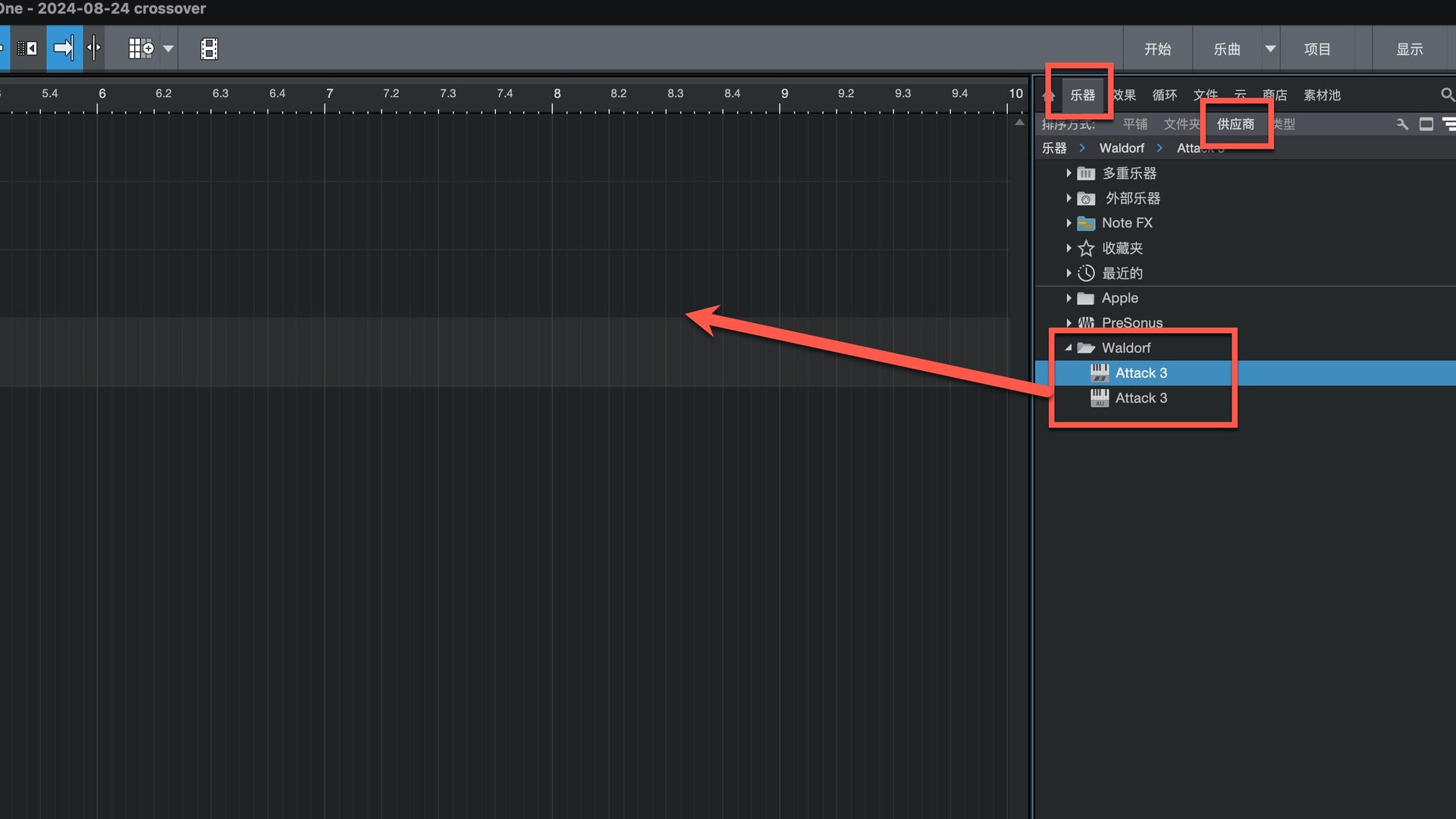 打开Studio One在乐器-供应商下即可找到插件,拖动到左侧即可