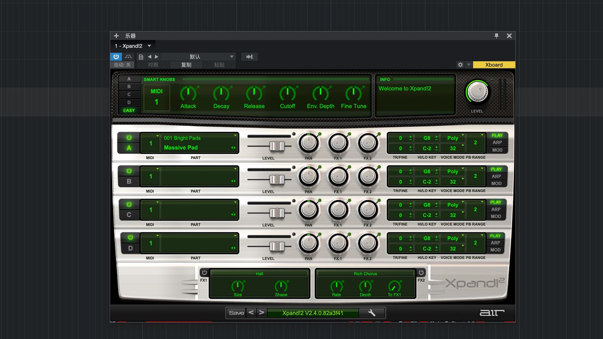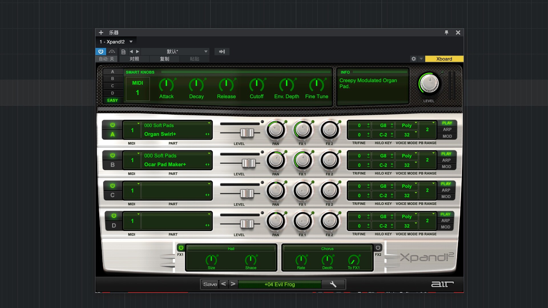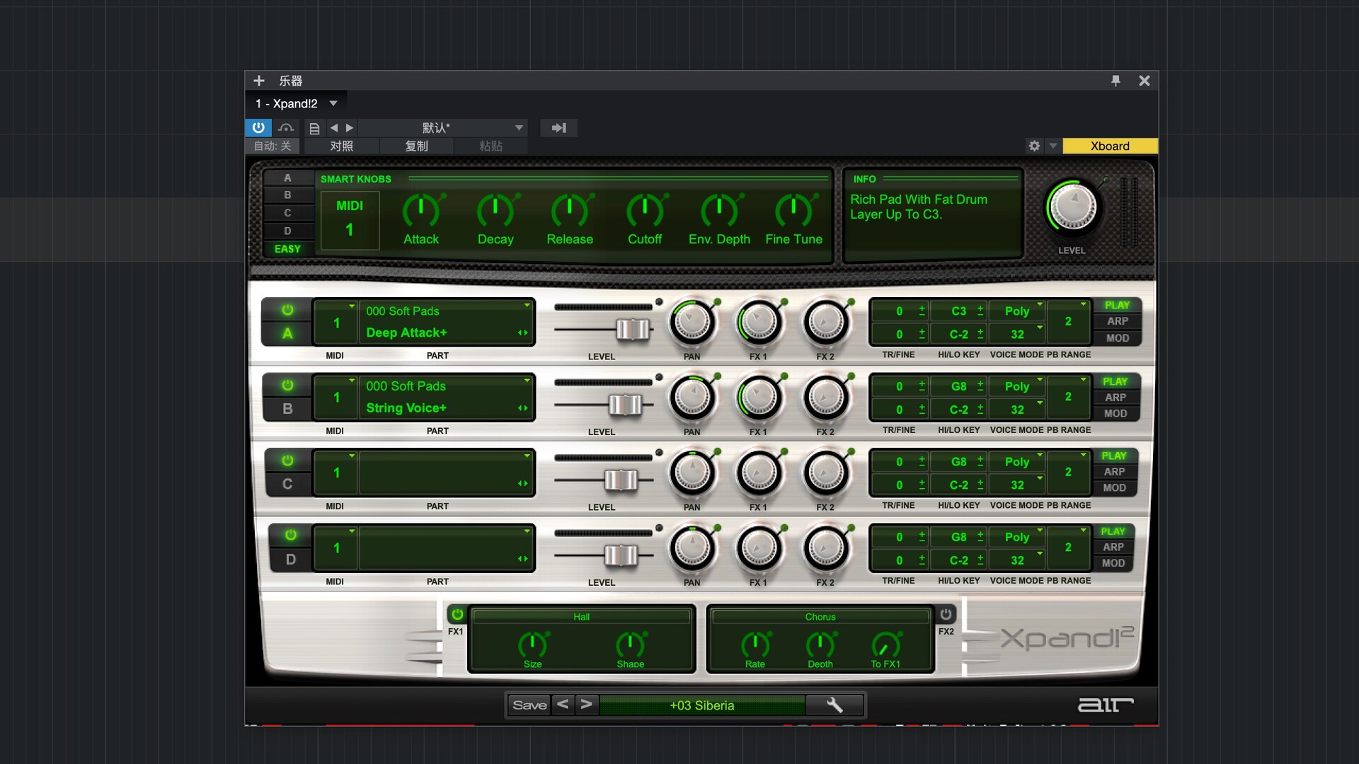 Xpand!2 是一款多音色工作站,每个音色提供四个激活的音色槽,或称“声部”。每个声部都拥有独立的 MIDI 通道、音符范围(区域)、混音、琶音、调制和效果设置——这是创建独立声部的绝佳方式。将四个声部组合起来,构建一个惊艳的音色,正是 Xpand!2 真正展现其强大之处的地方。每个声部的音色模式都可以设置为复音或单音。复音声部最多可包含 64 个复音;单音声部提供“第一”、“最后”、“最高”或“最低”优先级,方便指定贝斯、主音或独奏乐器。