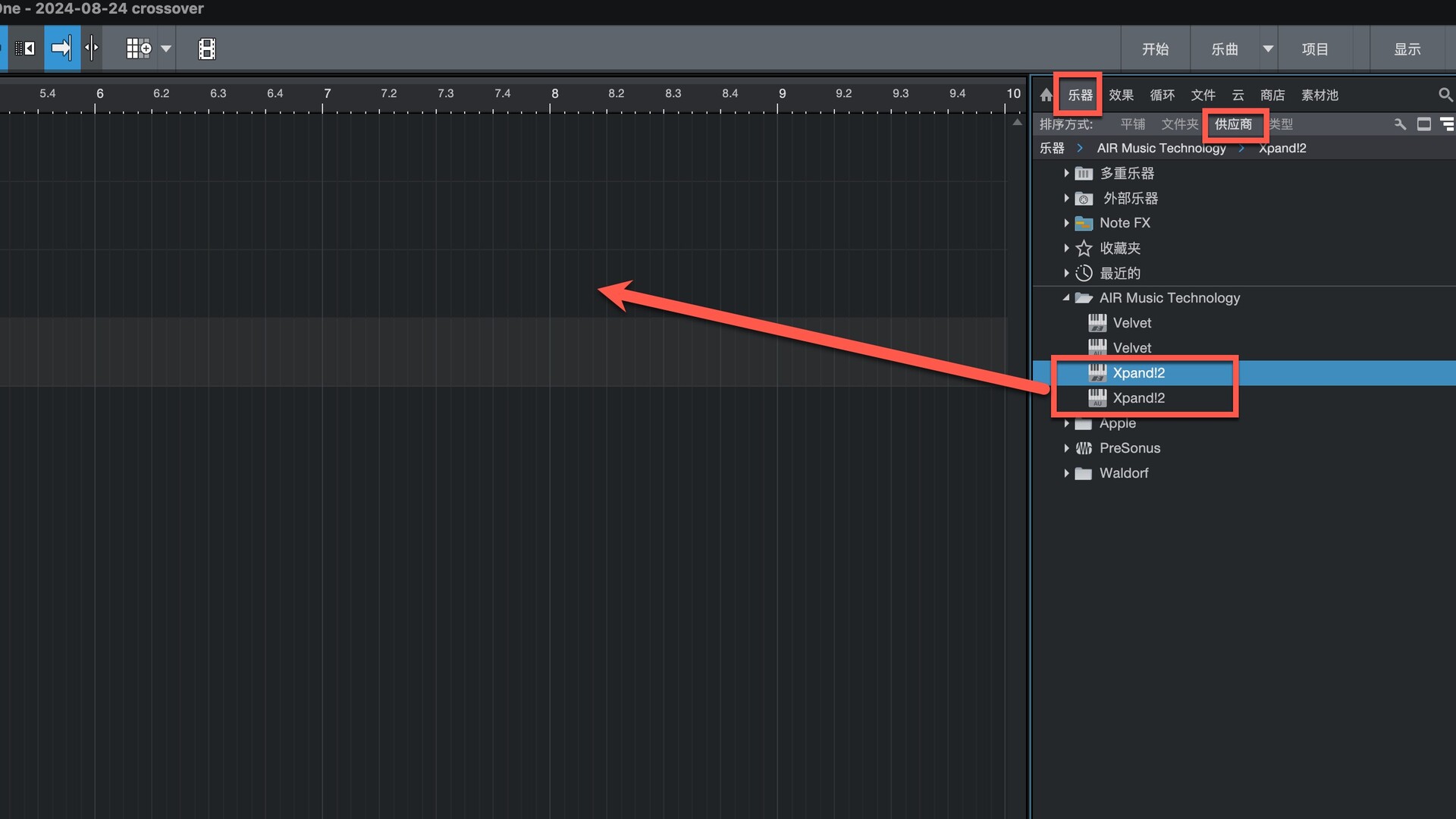 打开Studio One在乐器-供应商下即可找到插件,拖动到左侧即可
