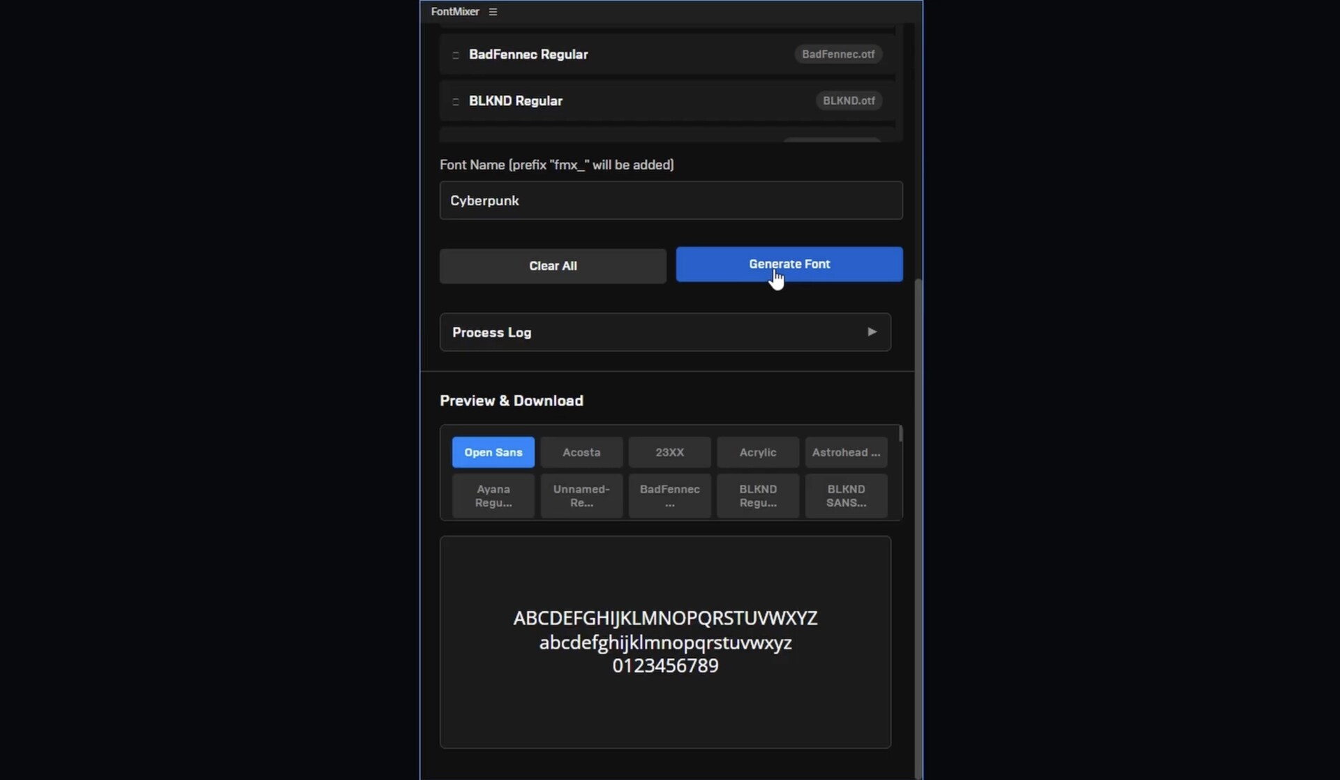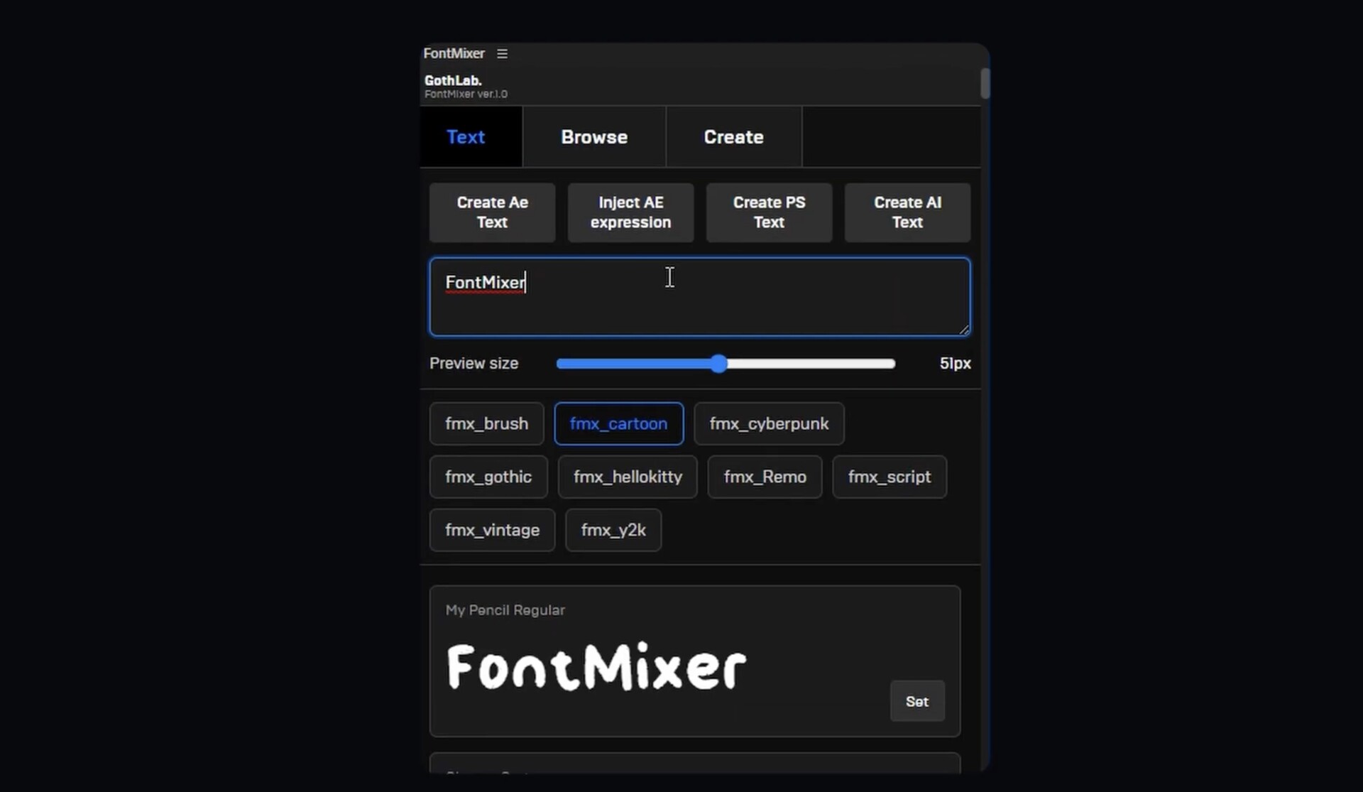 FontMixer 是一款面向 Adobe After Effects、Photoshop 和 illustrator 的字体管理扩展脚本,设计目的是改善在这些软件中使用大量字体的工作流程。它允许用户将最多 100 个字体文件合并为一个特殊的字体文件进行统一管理,在插件面板中实时预览并快速切换应用到文本图层,从而大幅提升在 Adobe 软件中查找和测试大量字体时的效率;插件本身不包含字体,仅作为整合与调用工具使用。