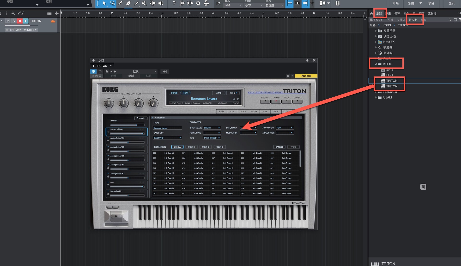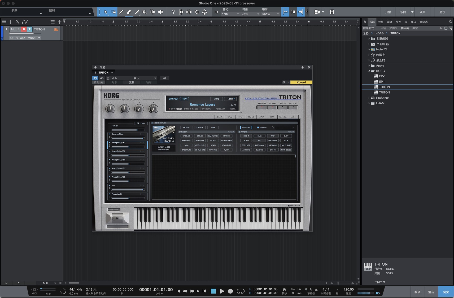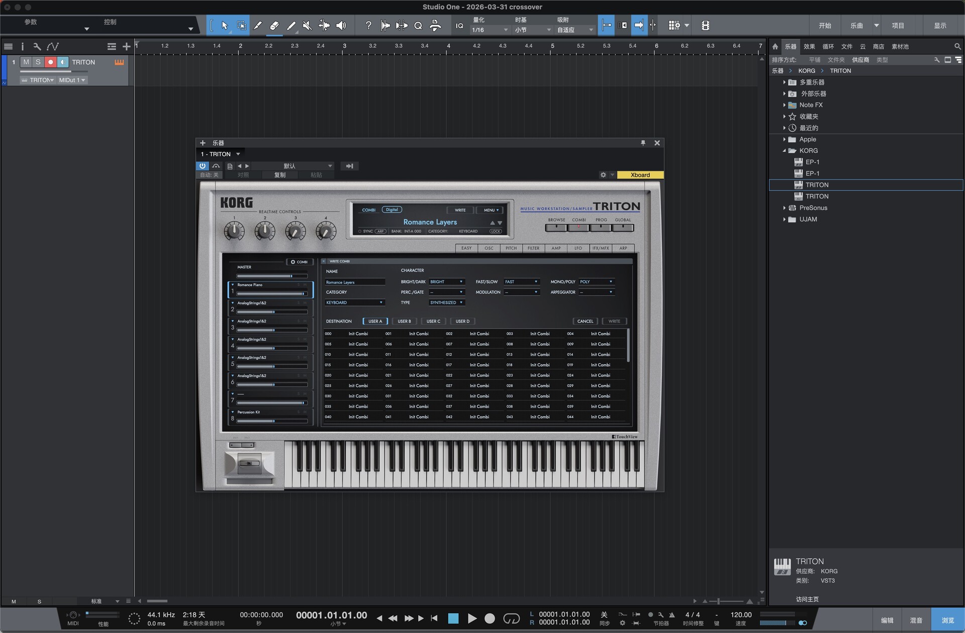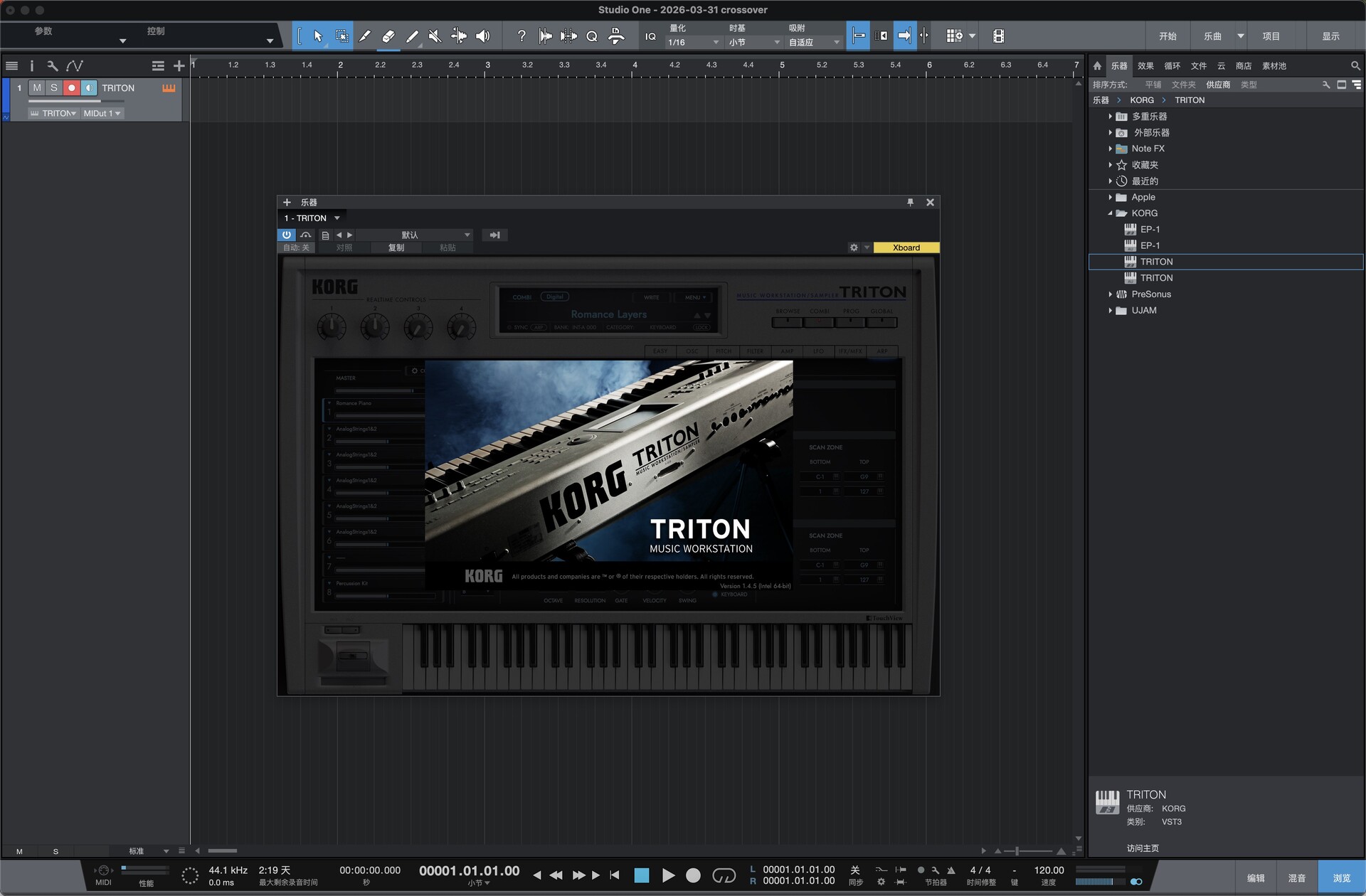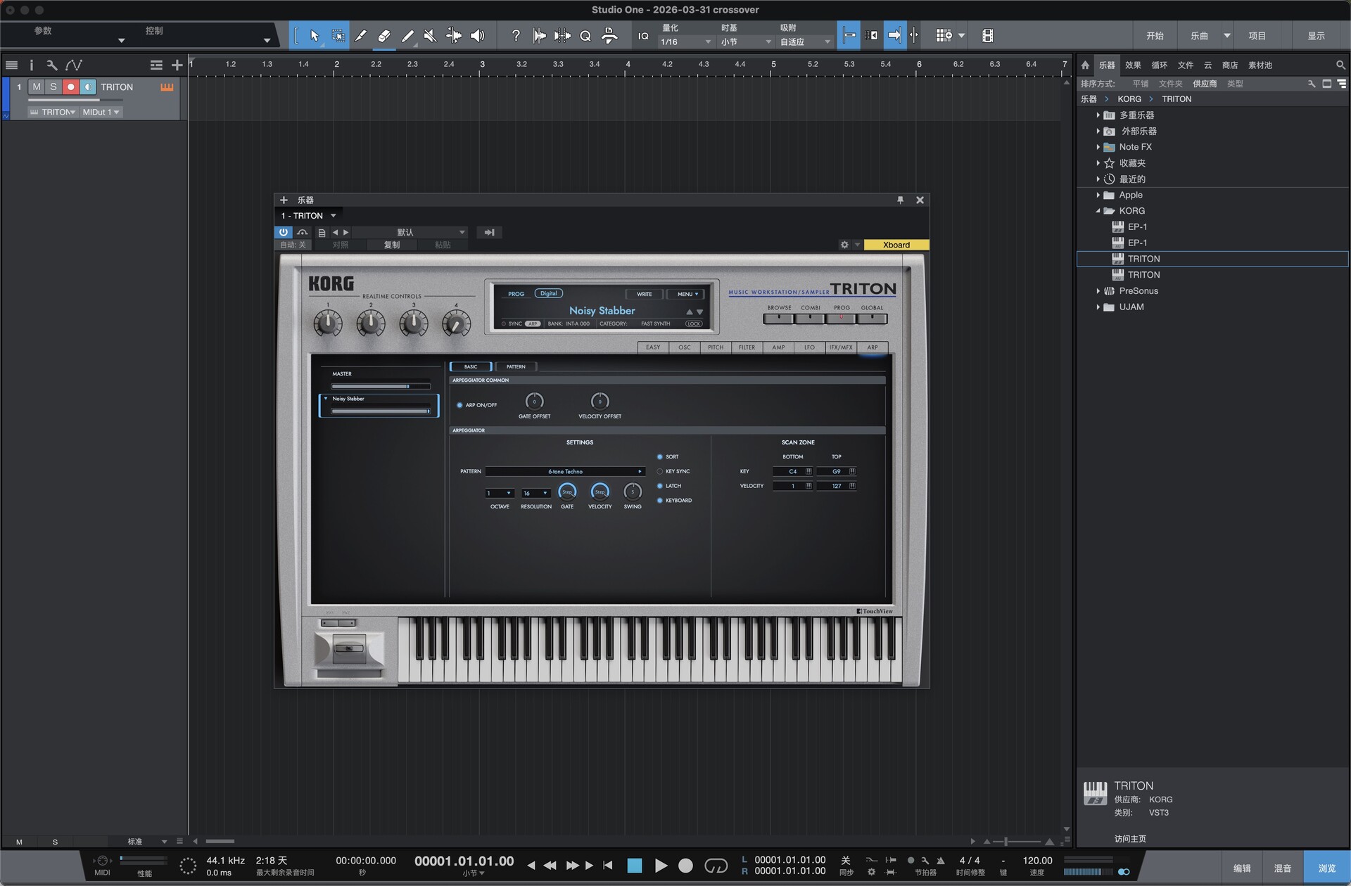 HI 合成系统完整复刻 底层 1:1 还原 TRITON 硬件的 HI 合成架构,包含 48kHz 高规格 PCM 采样库、双类型滤波器、5 个插入效果(IFX)、2 个主效果(MFX)、主均衡器,支持 8 声部多音色组合(Combi),复音数与信号路由逻辑与硬件完全一致,保留硬件独有的动态与质感KORG。 海量原厂 + 扩展音色库 内置原厂全部预设,完整收录 8 张 EXB-PCM 扩展卡音色,总程序数超4000 个,覆盖钢琴、弦乐、鼓组、贝斯、合成主音、氛围音效等全品类,无冗余填充音色,可直接用于制作KORGKORG。 高效音色管理与编辑 搭载分类标签式声音浏览器,可按乐器类型、音色特征快速筛选;新增EASY 模式,简化振荡器、滤波器、效果器等核心参数调节,兼顾新手快速上手与深度编辑需求KORG。 强大琶音与律动引擎 内置硬件同款双复音琶音器,提供 307 种预设模式(含旋律、Riff、鼓组律动等),支持实时参数调制,快速生成标志性律动与织体,适配现代编曲与即兴创作KORG。 macOS 原生适配与兼容性 原生支持 macOS 系统,提供 VST3、AU 插件格式,完美兼容 Logic Pro、Ableton Live 等主流 DAW,支持 MIDI 映射与宿主自动化,低延迟运行,适配从笔记本到工作站的全场景制作需求。 原厂开发团队监督 由 TRITON 硬件原工程师全程监督开发,从算法到细节参数均经过精准调校,确保软件音色、动态、响应与硬件无差异,还原经典工作站的真实体验。