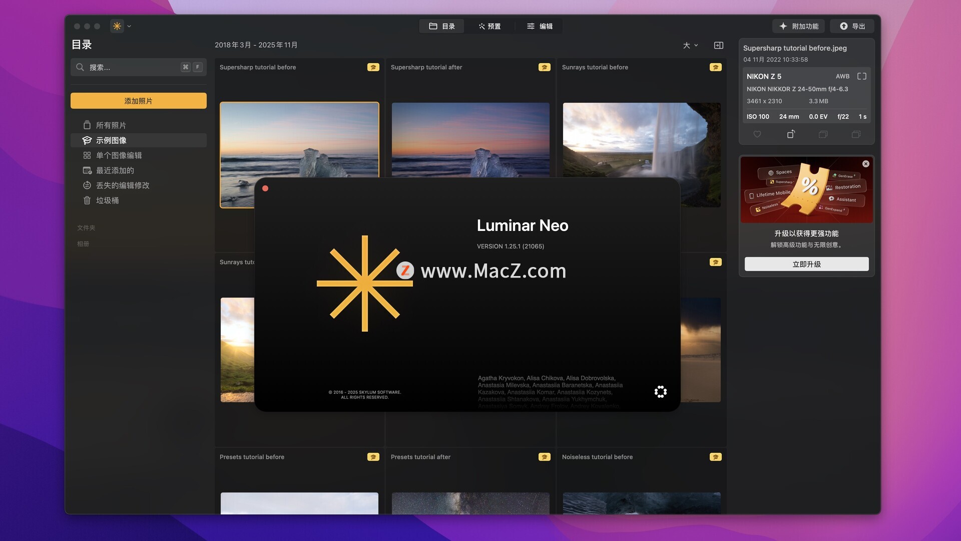 该软件还具有灵活的创意工作流程,使用户能够更好地组织和管理编辑过程。通过图层工作流,用户可以探索创造力、组合不同图像、添加文本和图形元素,并对其进行个性化设置。此外,Luminar Neo还支持智能对象识别技术,使用户能够快速识别并编辑照片中的主题和背景。测试环境:MacOS 15.5