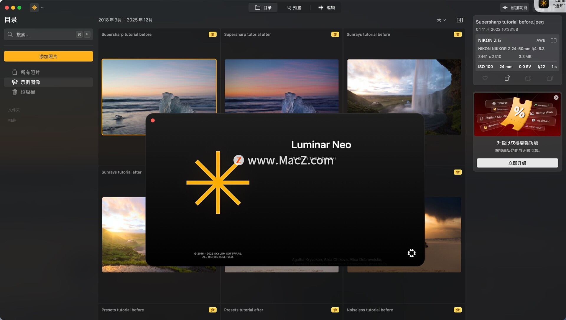 该软件还具有灵活的创意工作流程,使用户能够更好地组织和管理编辑过程。通过图层工作流,用户可以探索创造力、组合不同图像、添加文本和图形元素,并对其进行个性化设置。此外,Luminar Neo还支持智能对象识别技术,使用户能够快速识别并编辑照片中的主题和背景。测试环境:MacOS 26.2