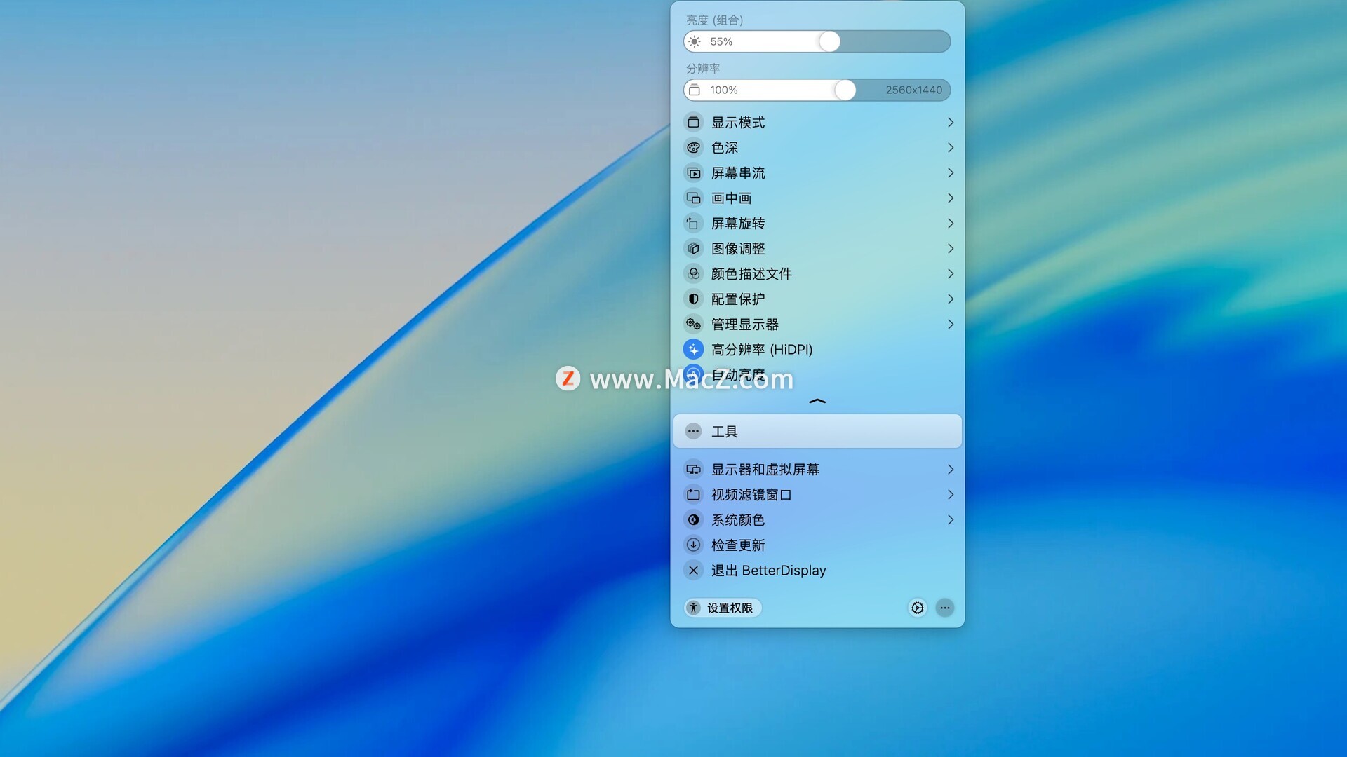 - 自定义分辨率与亮度控制: BetterDisplay 提供多种方法实现 XDR/HDR 的亮度提升,支持多达 1600 尼特的亮度,确保用户可以充分利用显示器的亮度潜力。同时,允许用户通过软件和硬件(DDC)控制显示器的亮度、音量和色彩。