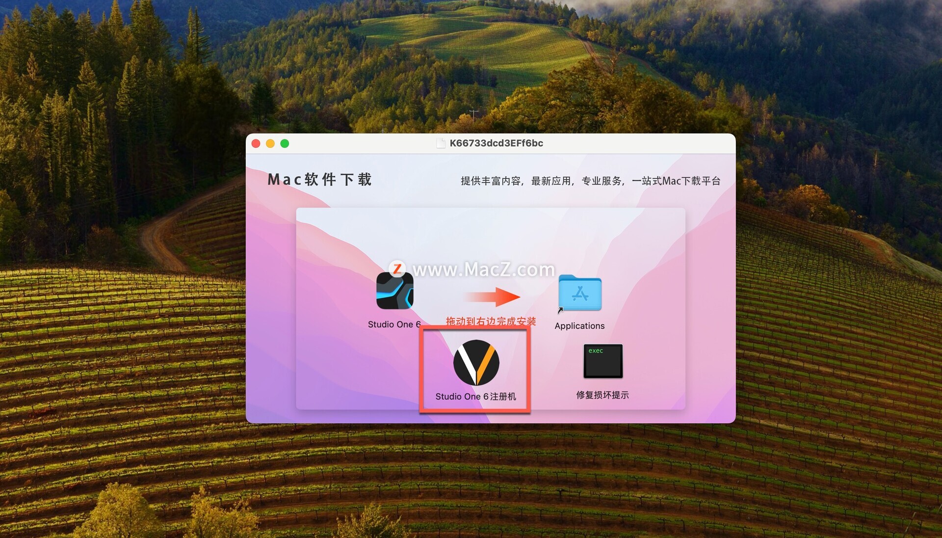 将左侧【StudioOne6】拖拽至右侧【Applicatios】应用程序中进行安装。