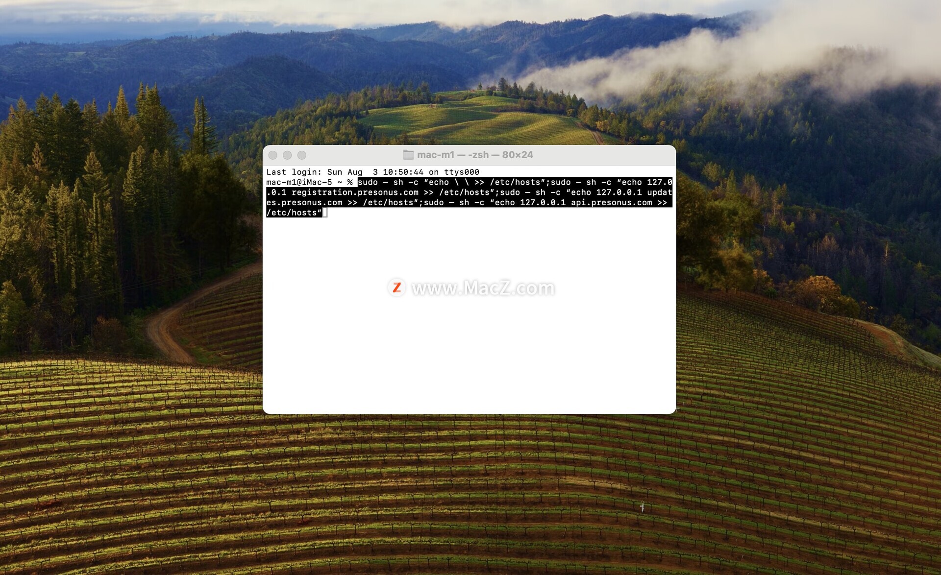 sudo -- sh -c "echo \ \ >> /etc/hosts";sudo -- sh -c "echo 127.0.0.1 registration.presonus.com >> /etc/hosts";sudo -- sh -c "echo 127.0.0.1 updates.presonus.com >> /etc/hosts";sudo -- sh -c "echo 127.0.0.1 api.presonus.com >> /etc/hosts"