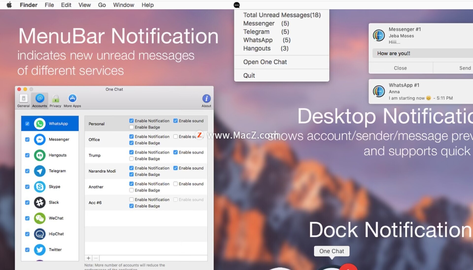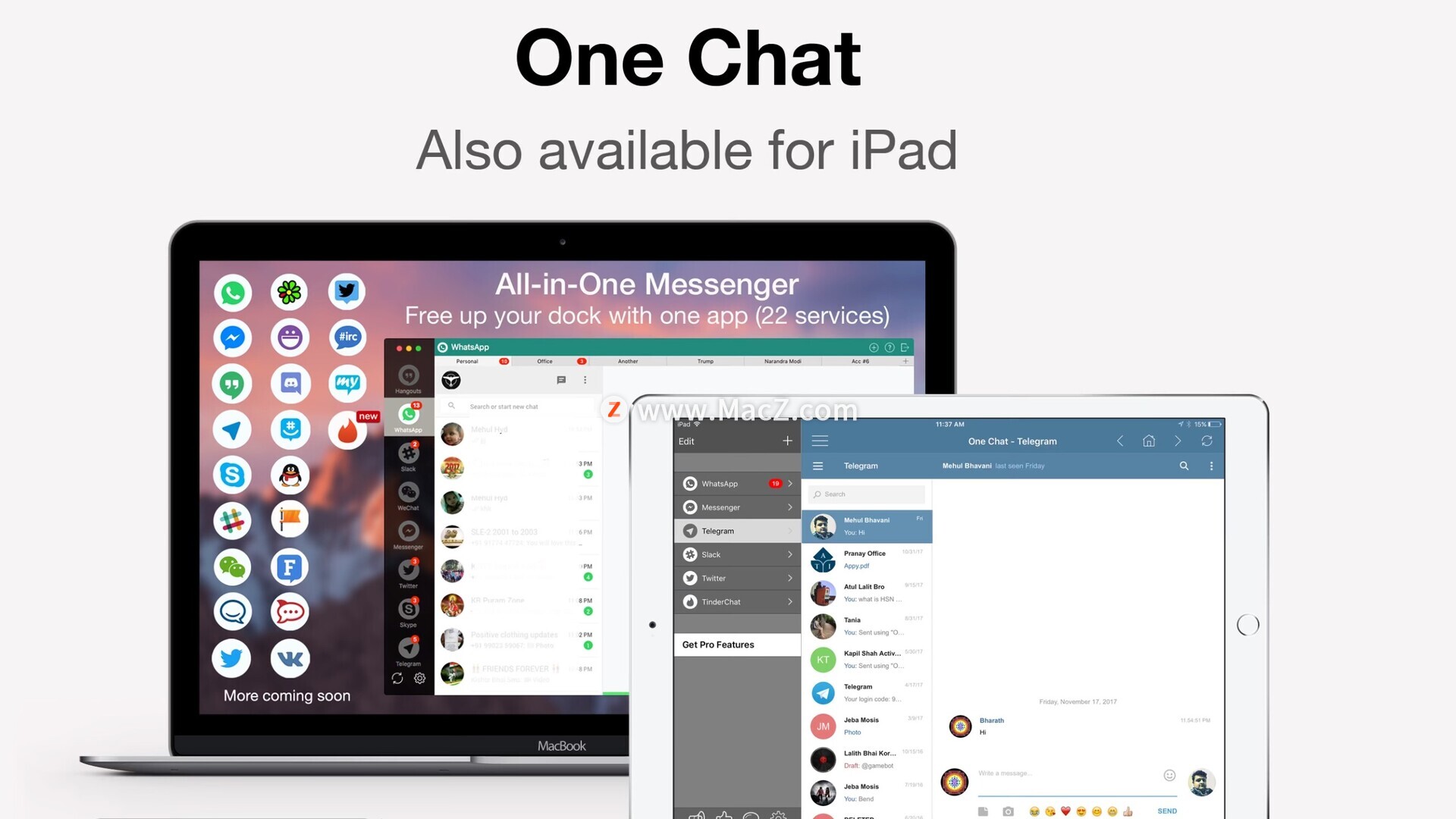 One Chat for Mac版,一款适用于所有消息服务的应用程序。将其用于以下信使并像老板一样聊天:- WhatsApp、Facebook Messenger、Hangouts、Telegram、Skype、Slack、微信、Twitter、YahooChat、ICQ 聊天、HipChat、Discord、GroupMe、QQ、Facebook Page Messenger VK、Fleep、 RocketChat、MySMS、IRC 聊天、TweetDeck Tinder。