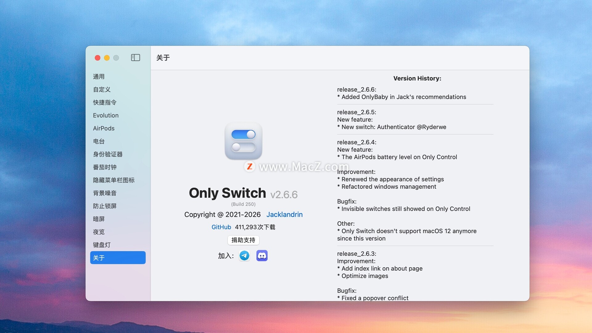 Only Switch是一款专为Mac用户设计的软件,可以在菜单栏一键控制系统功能。它包含多种功能,如隐藏桌面、切换黑暗模式、保持亮屏、屏幕保护和AIrPods连接。这款软件方便快捷,只需点击一下即可开启各种功能,未来还会开发更多功能。测试环境:MacOS 15.7