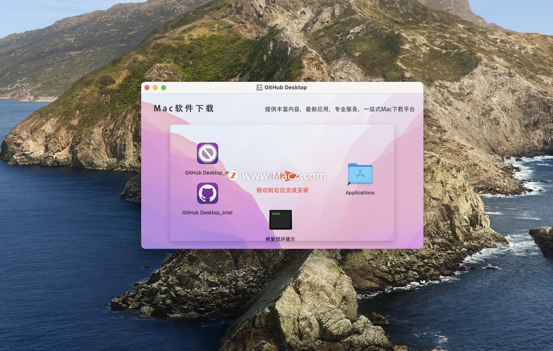 安装包下载完成后,拖动左侧的GitHub Desktop到右侧应用程序中即可