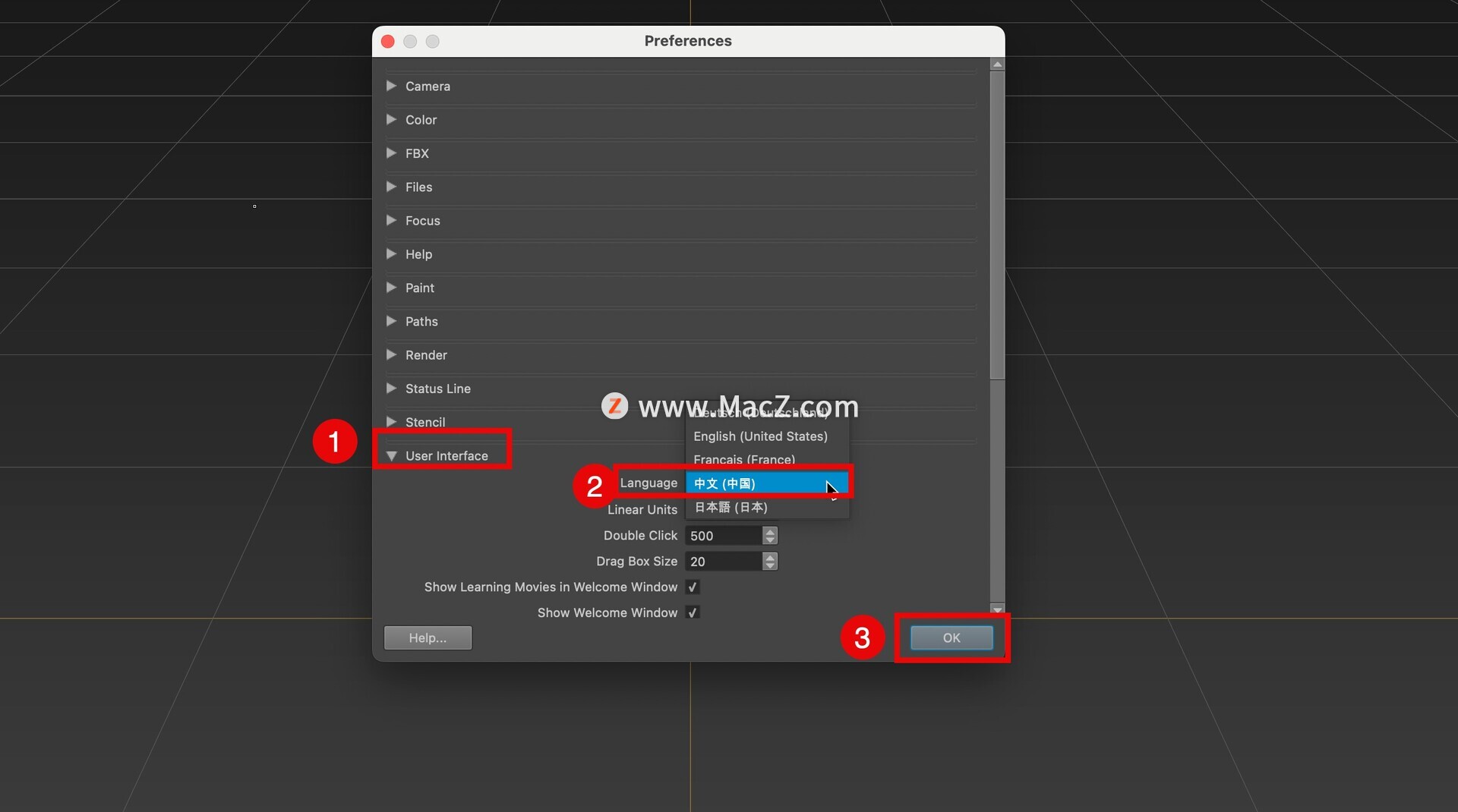 User interface选择中文,点击OK然后 重启软件!!!一点要重启软件才可!