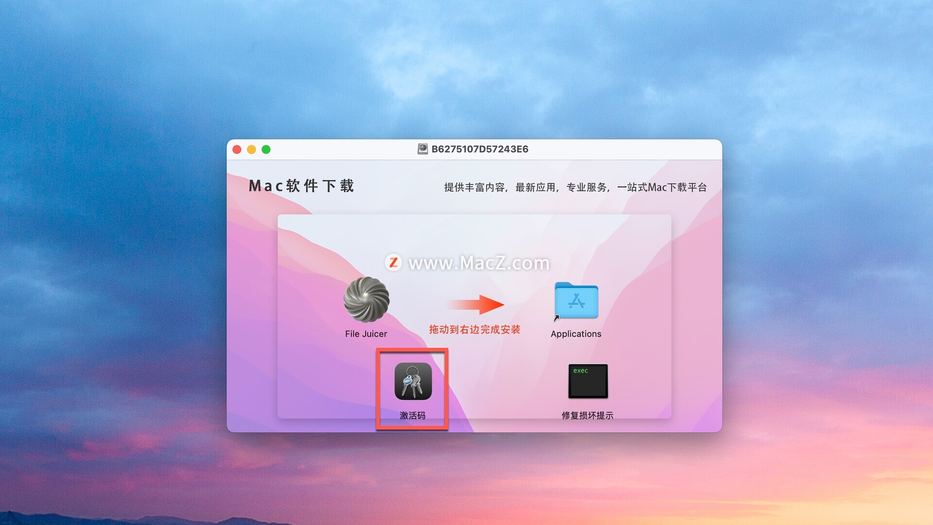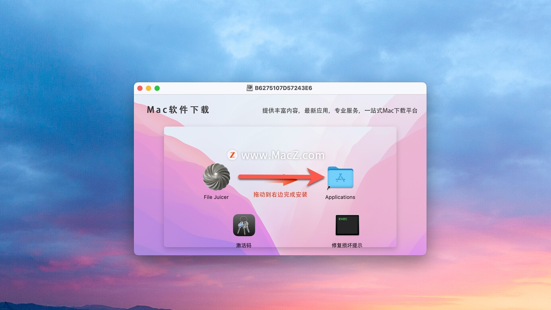 安装包下载完成后,将File Juicer拖到右侧应用程序安装