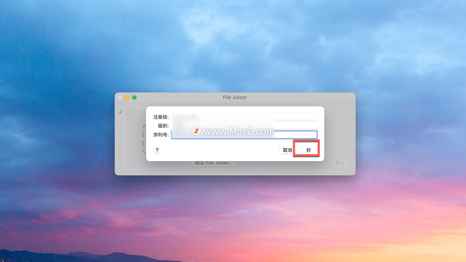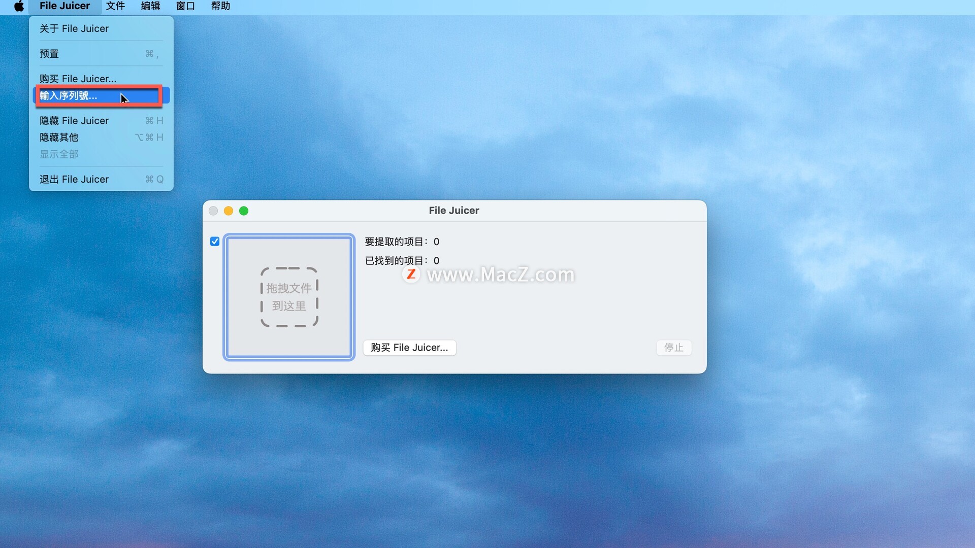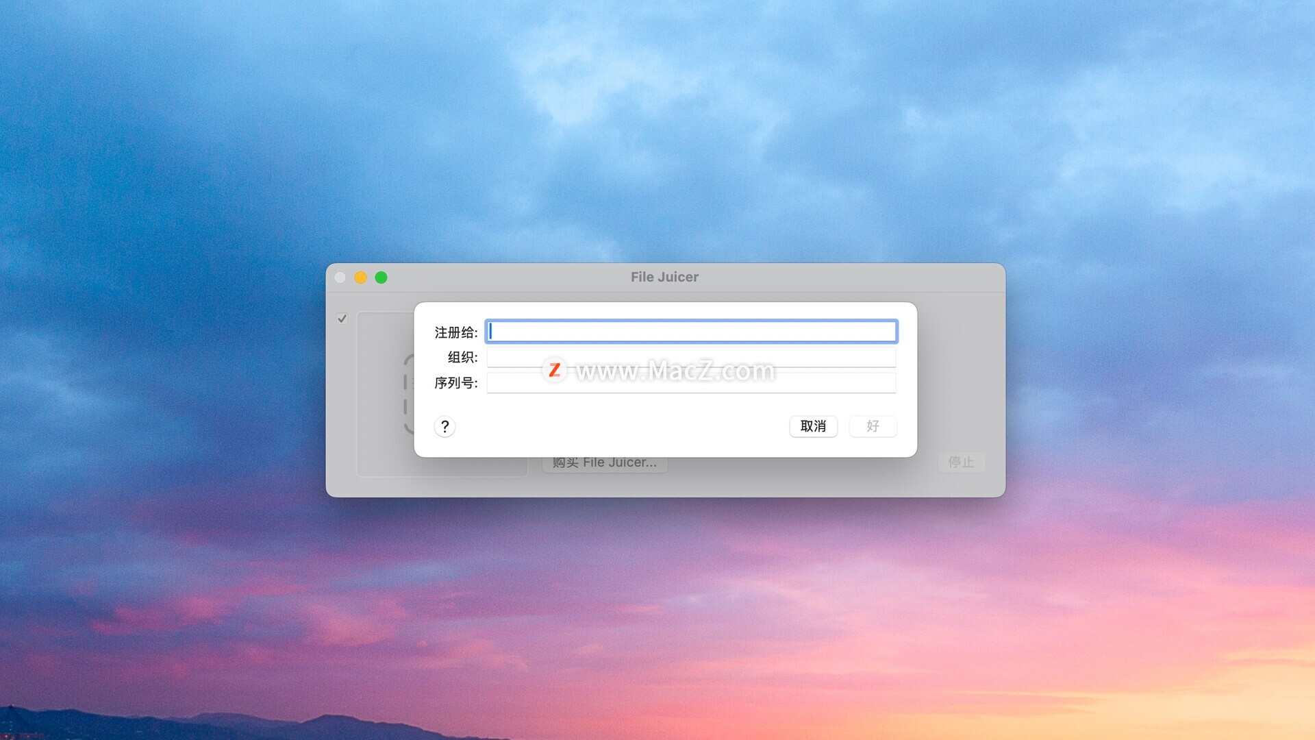 打开应用,点击菜单栏左上角-File Juicer-输入序列号