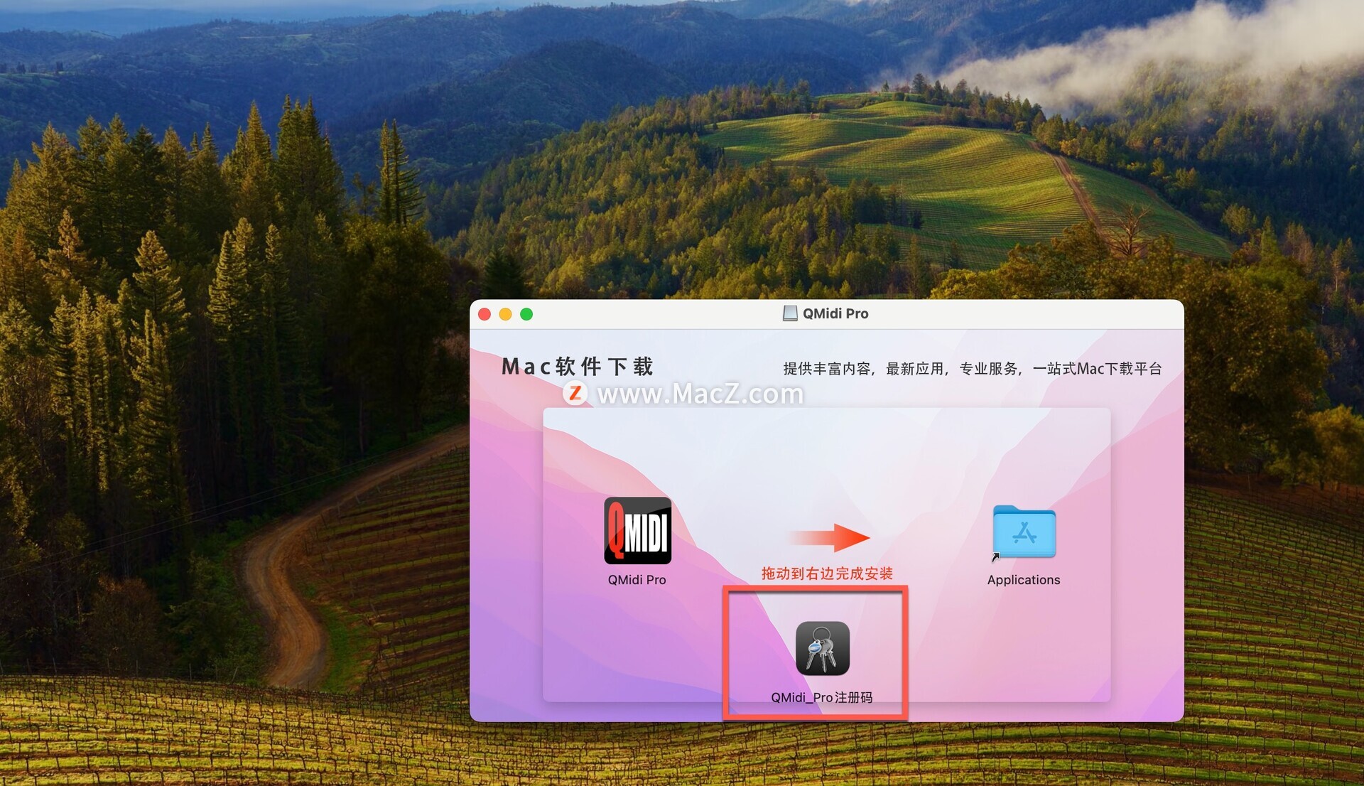 软件下载完成后,拖动QMidi Pro到右边的应用程序中进行安装