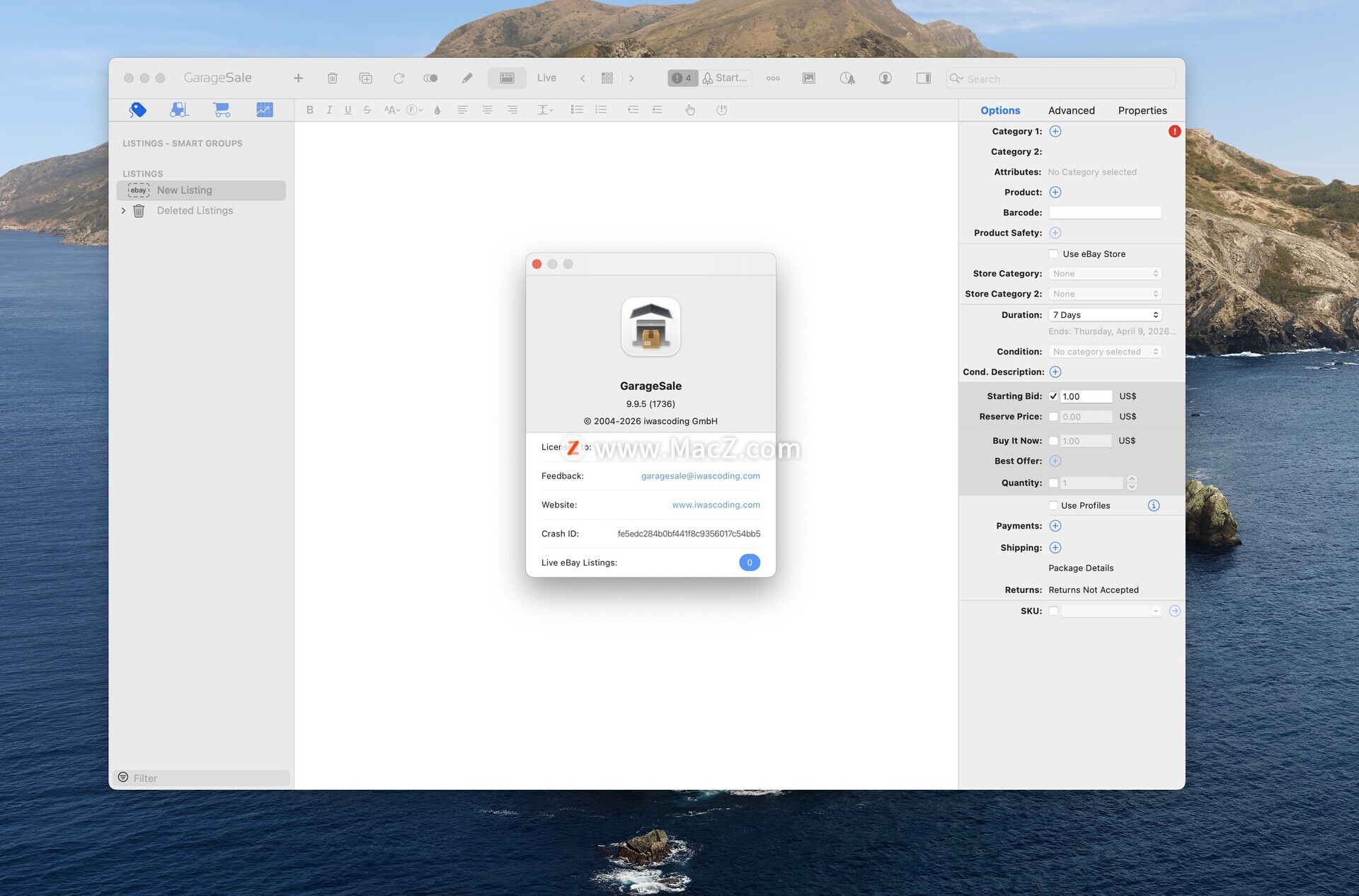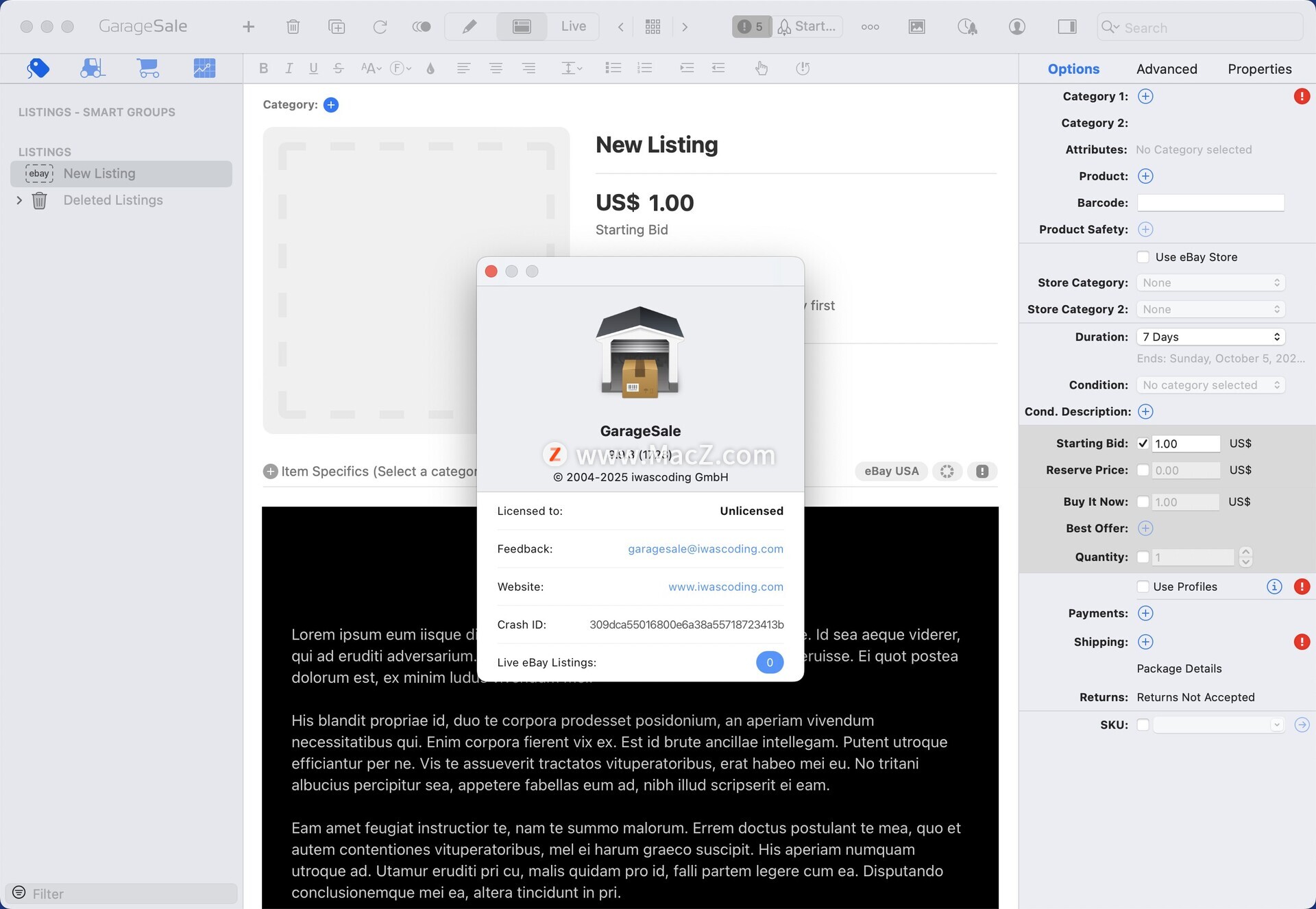 按住选项键并调用多个列表的“复制列表链接”命令时,链接之间会插入一个空白行 自动更新列表状态时,如果 eBay 服务器无法访问,则防止弹出错误面板 修复了加载预览时可能将列表持续时间设置为 30 天的问题 修复了选择多个列表时无法正确删除项目细节的问题 尝试删除属性时添加警告 添加了设置以控制计算的运输包装尺寸的舍入行为 解决了内置调度程序和缺少类别元数据的问题 增加了对 eBay 意大利“零件兼容性”的支持 由于付款现在由 eBay 处理,“付款说明”字段已被删除 计算运费:如果包裹重量或尺寸值使用小数,GarageSale 将向 eBay 发送下一个更大的整数值 当在修改面板中选择“运输选项”框时,包裹尺寸现在也会被修改 修复 macOS 15.2 下列表图标颜色问题