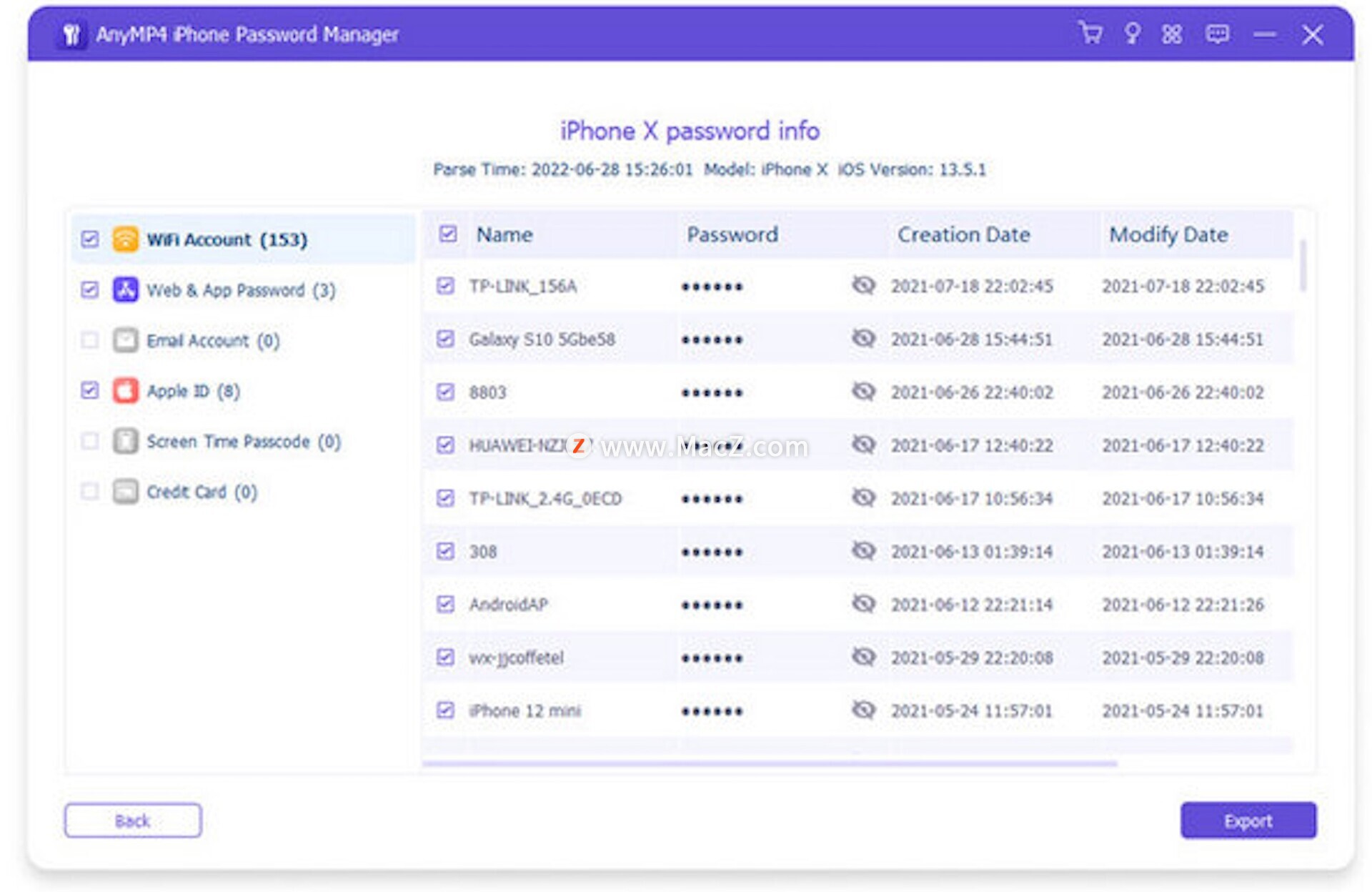 AnyMP4 iPhone 密码管理器是一款功能齐全的密码管理工具,具有令人惊叹的功能,可确保您的重要信息安全。它可以帮助您查找、管理甚至找回 Apple ID、Wi-Fi、邮件帐户、网站、应用程序、信用卡等的密码。它可以很好地查看 iPhone 上所有已保存的密码,并确保所有密码安全且易于查找。