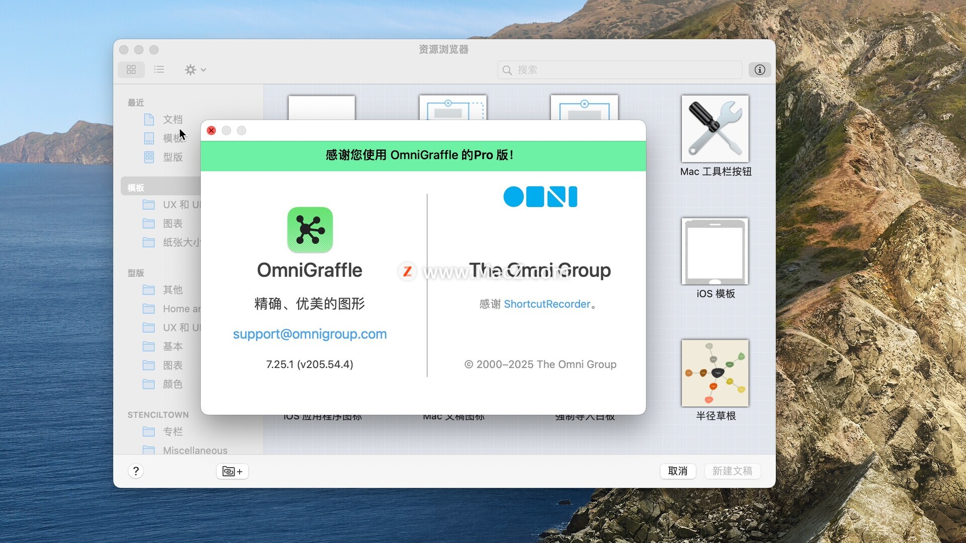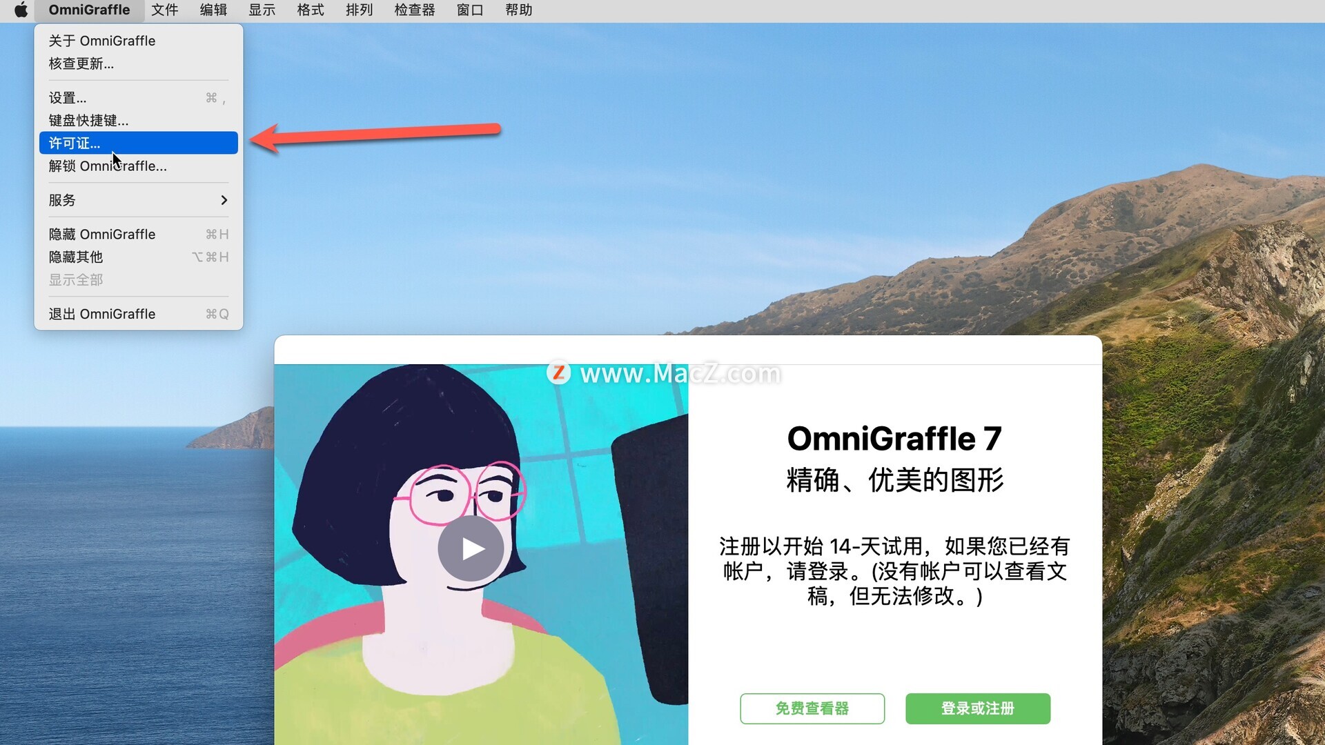 安装完成后打开,在OmniGraffle菜单栏选择许可证