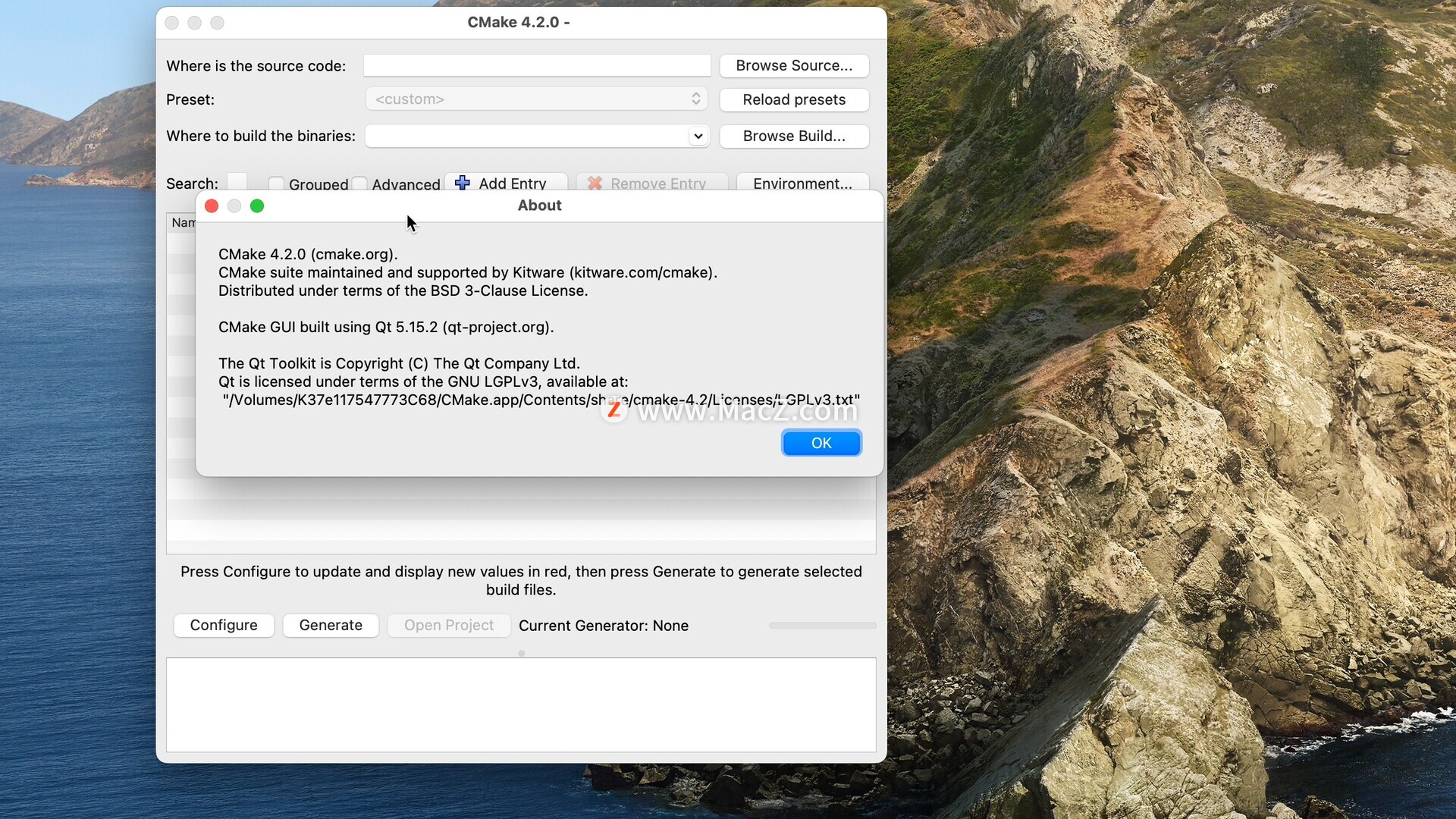 2CMake Mac版是一款Mac平台上免费的编译工具,CMake旨在构建、测试和软件打包。CMake是用于控制软件使用简单的平台和编译器编译过程独立配置文件。CMake生成本机makefile和工作区,可以使用您所选择的编译器环境。他能够输出各种各样的makefile或者project文件,能测试编译器所支持的C++特性,类似UNIX下的automake。测试环境:MacOS 13.7.6