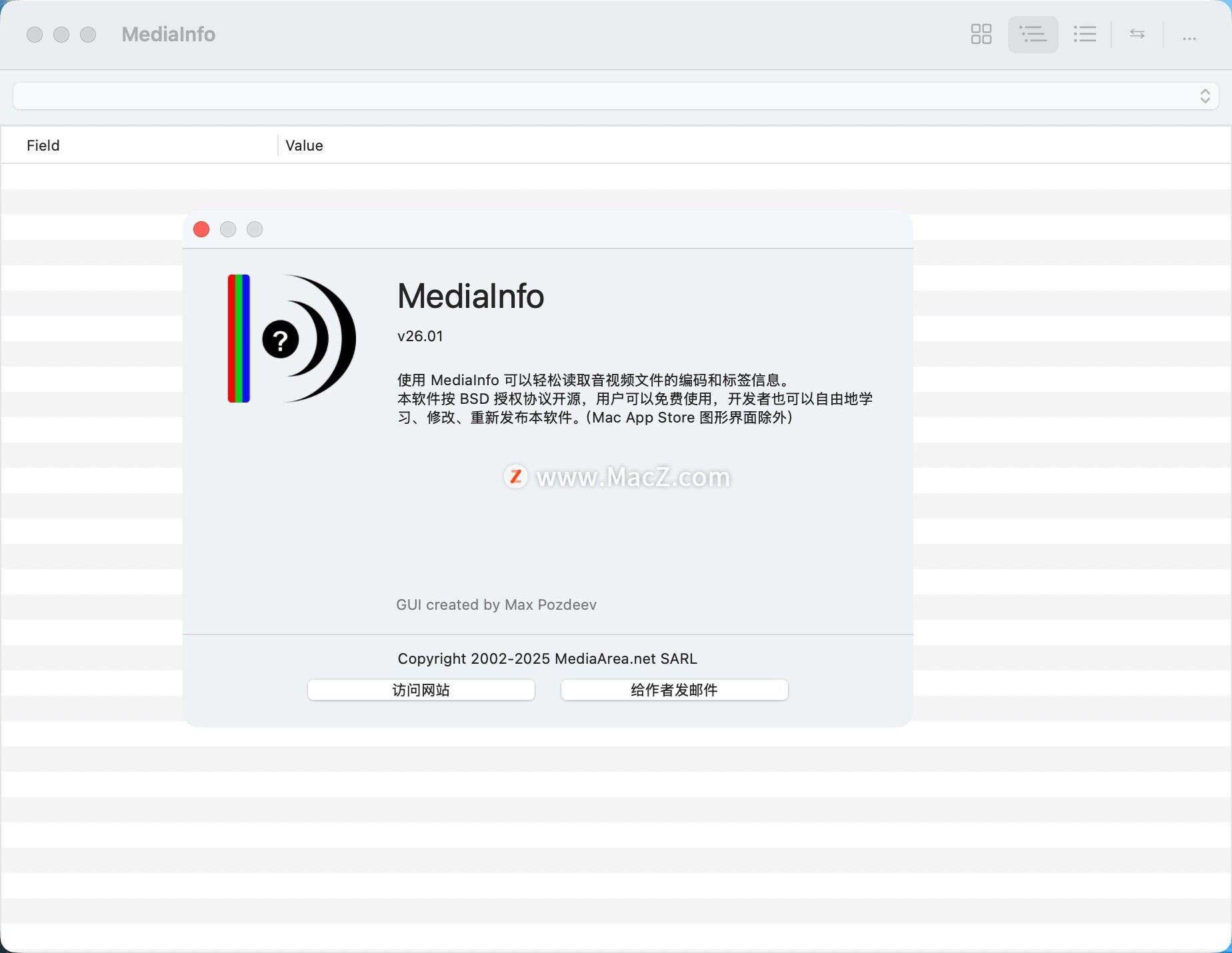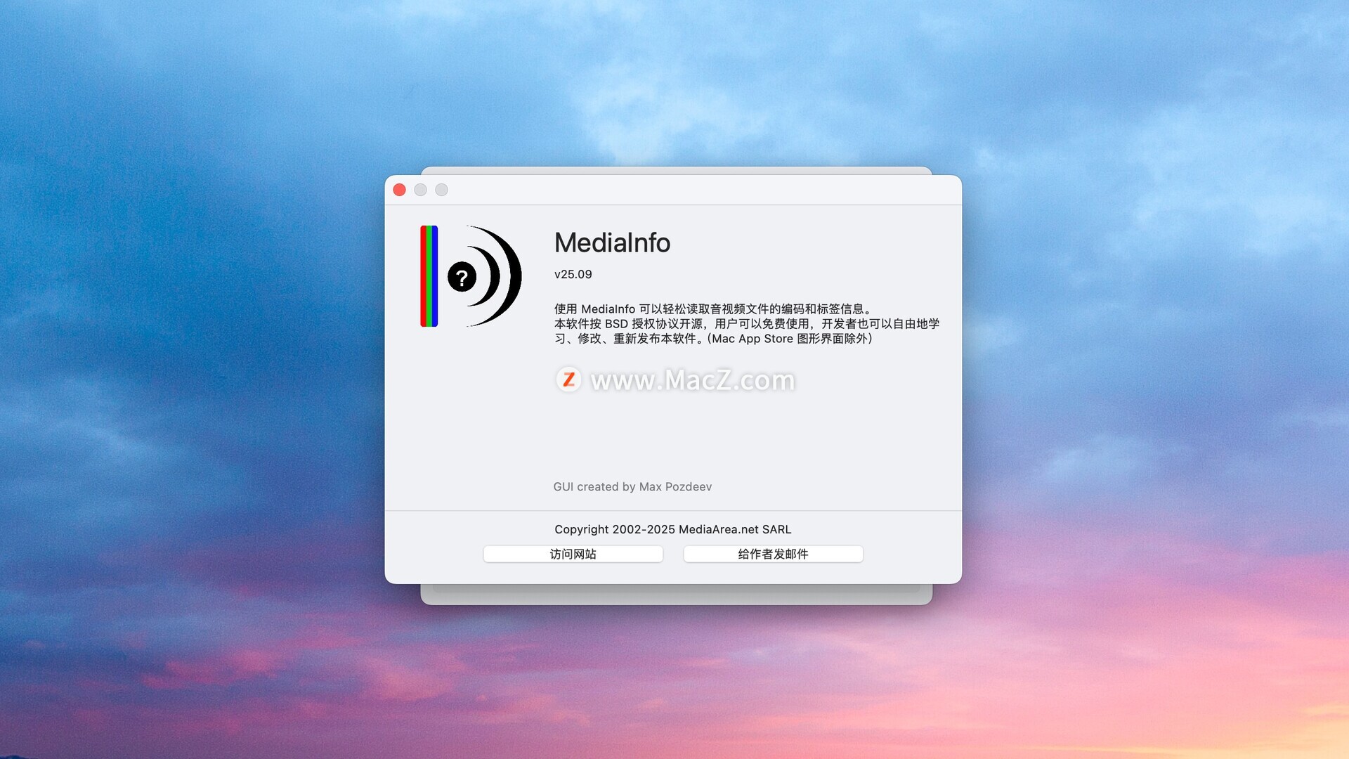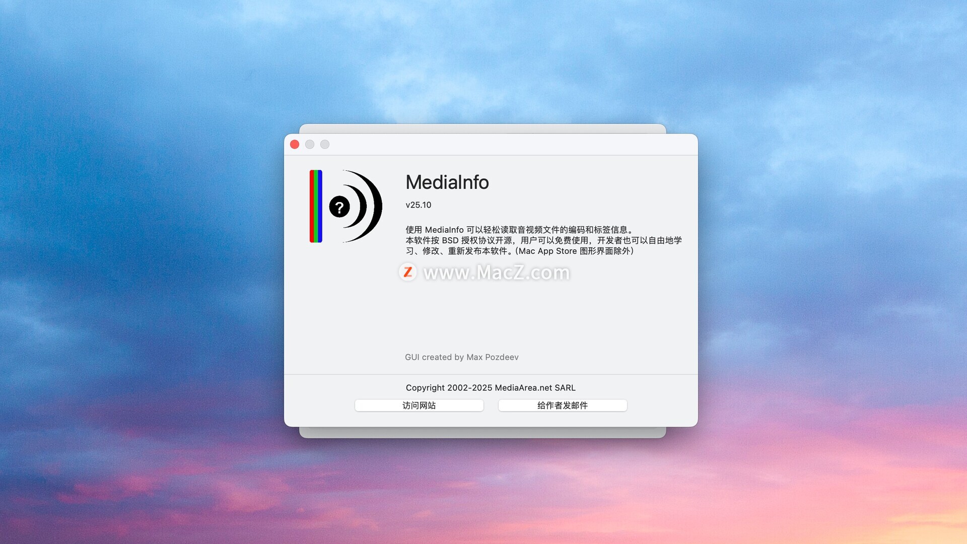 MediAInfo是应用在Mac上的一款音视频编码检测工具,用来分析视频和音频文件编码和内容信息的工具。支持众多视频和音频文件格式,以及多种查看方式文本,表格,树形图,网页……信息可导出为文本,CSV,HTML等文件,多国语言,支持简体中文。