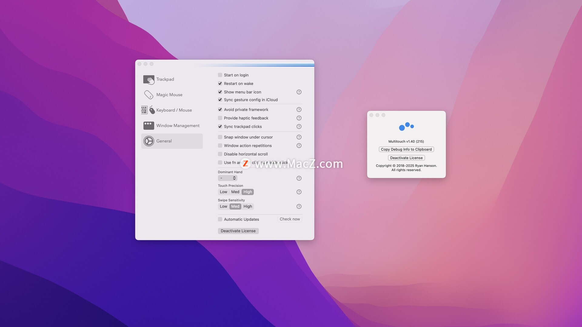 Multitouch Mac版是Mac平台上的一款可以增强你的多点触控手势的神器。Multitouch Mac版可以让你将一个自定义的动作绑定到一个特定的魔力轨迹板或魔术鼠标手势。您的电脑就像额外加了一个多侧键鼠标一般,而且只要您需要侧键是无限的。测试环境:MacOS 15.0